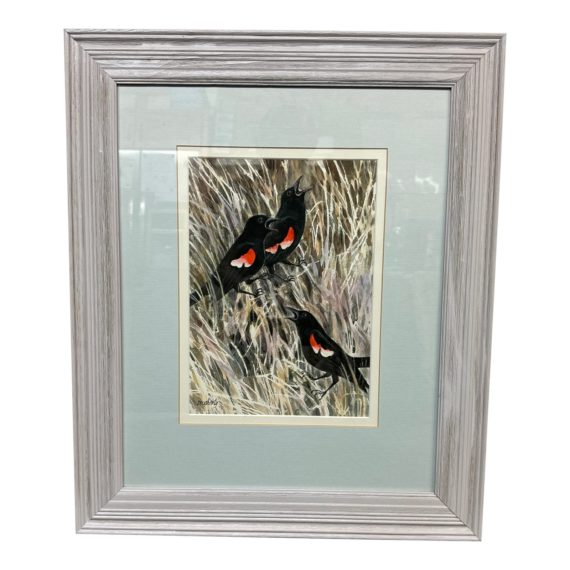 Design Plus Gallery presents an Original Watercolor Painting signed Dougherty. The calls echoing in the field, this trio has something to sing about. The bright red tipped coloring delights the viewer. Signed by artist on lower left, the painting has been matted in robins egg blue and framed. Light surface wear; condition is consistent with age and use.