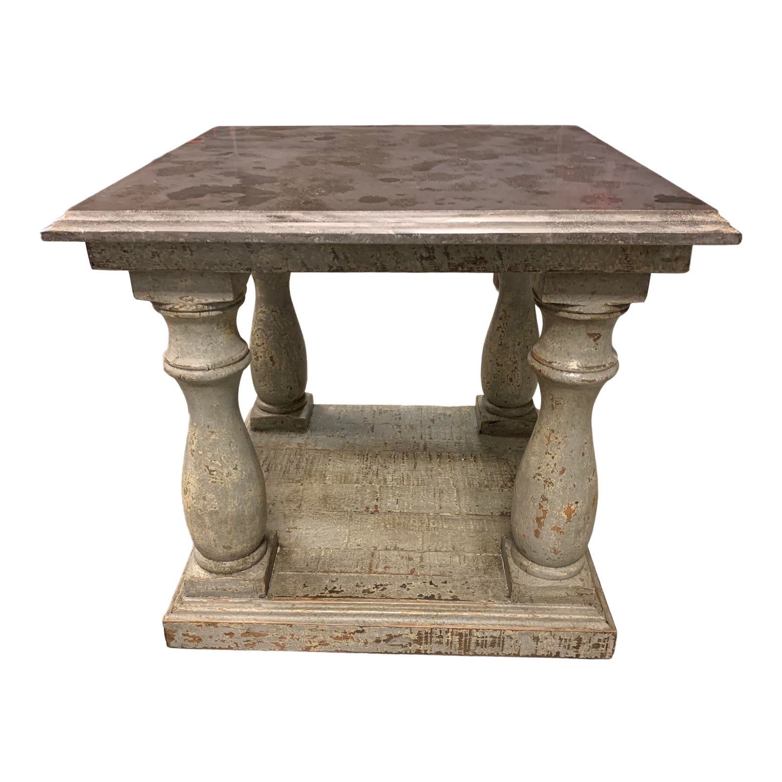Design Plus Gallery presents a Palermo Side Table by Dovetail Furniture. From the Palermo Collection. The base is wood with a distress blue finish. Crowned with a polished blue stone top with edge detail, the wood base features turned legs. Sturdy and strong, the lower shelf is perfect for storage. Minor wear.
