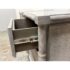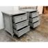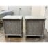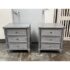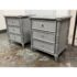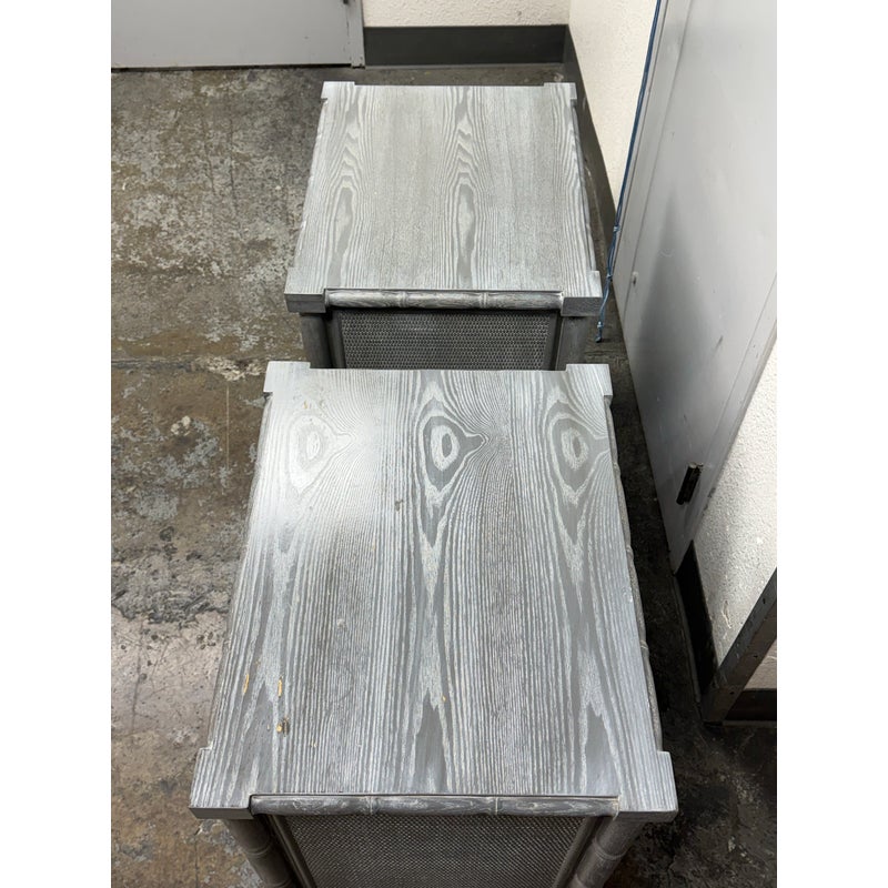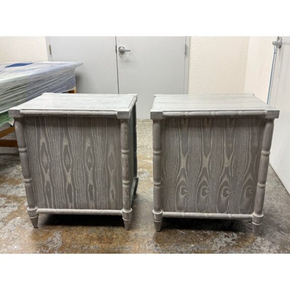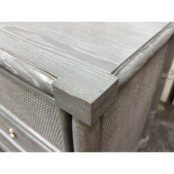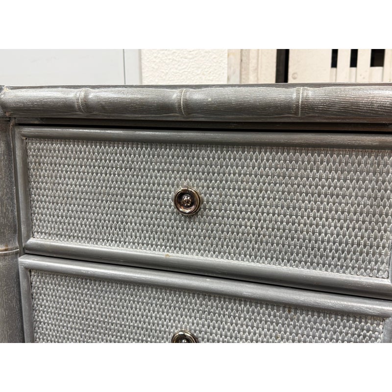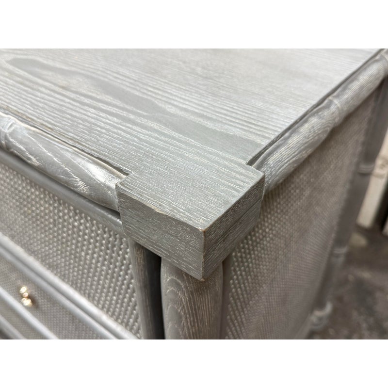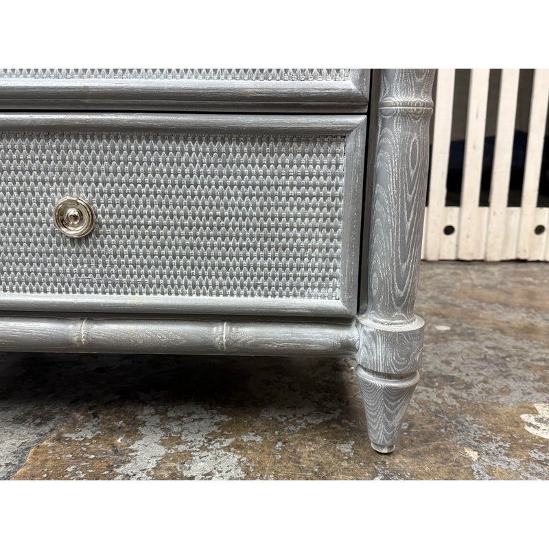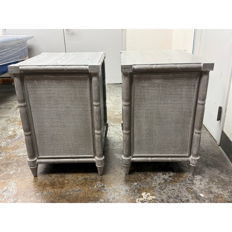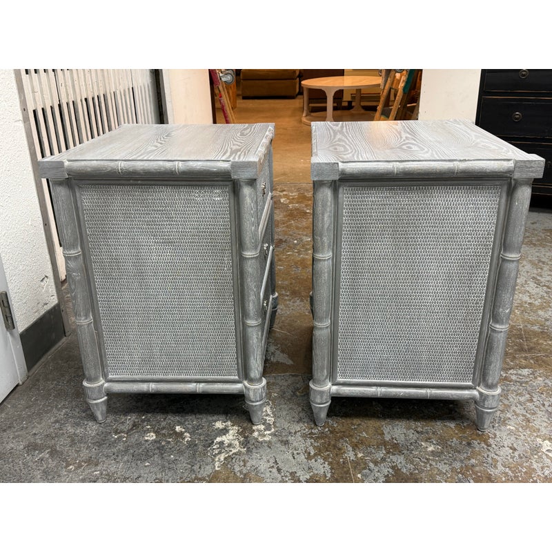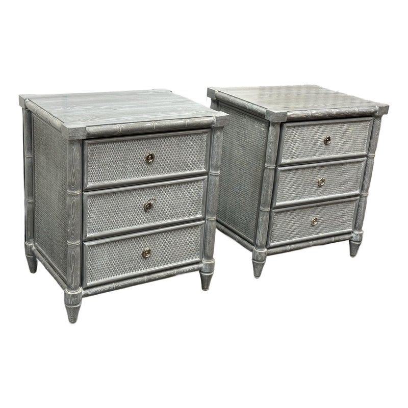 Design Plus Gallery presents a Pair of Nightstands from Dovetail Furniture. The nightstands have faux bamboo detailing with woven panel fronts. Each case is rendered in a gray treatment that highlights the wood grain, with bamboo form framing, tapered legs, and round metal pulls. The drawer fronts and side panels are inset with a woven texture that gives them a tailored, textural look, while the three-drawer design offers balanced proportion and storage capacity. This is a discontinued model from Dovetail Furniture. They are in good condition with visible and minimal wear from usage.