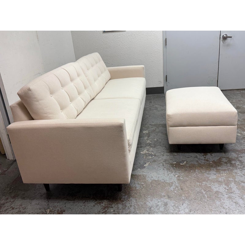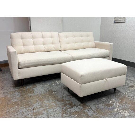 Design Plus Gallery presents the Turin Sleep Sofa from DreamSofa Modern and Matching Ottoman. DreamSofa’s sofa beds offer plush seating, ergonomic design, with easy pull-out conversion. The Turin is a handsome statement piece, is the essence of 1950s swank, and playfulness, with a modern day touch. This is the type of sofa that can live in an office to convert into a spare bed without sacrificing space, or style. Both pieces are wrapped in their Key Largo premium upholstery in the color Oatmeal. This beautifully woven fabric utilizes cationic yarn technology to create a unique contrasting color effect. The fabric is produced in environmentally friendly mills, and jet dyed to create exceptional color saturation and a highly polished look and feel. Behold their elegantly Mid-Century tapered legs that are retro revitalized in a beautiful way. The piece is in showroom like condo Made in the USA.