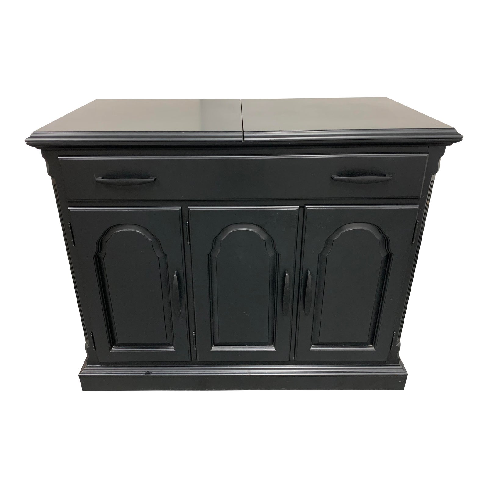 Design Plus Gallery presents a Drexel Extension Top Bar Sideboard. Black satin finish surround the counter height storage and serving unit. Doors below open for plenty of storage + felt lined drawer on top for storing serving utensils + silver. Molding on top folds out from the center with supporting anchors on each side for parties + events. Drexel has been making furniture for over 100 years in North Carolina. Makers mark on the inside of the drawer. Visible wear on frame.