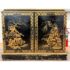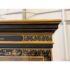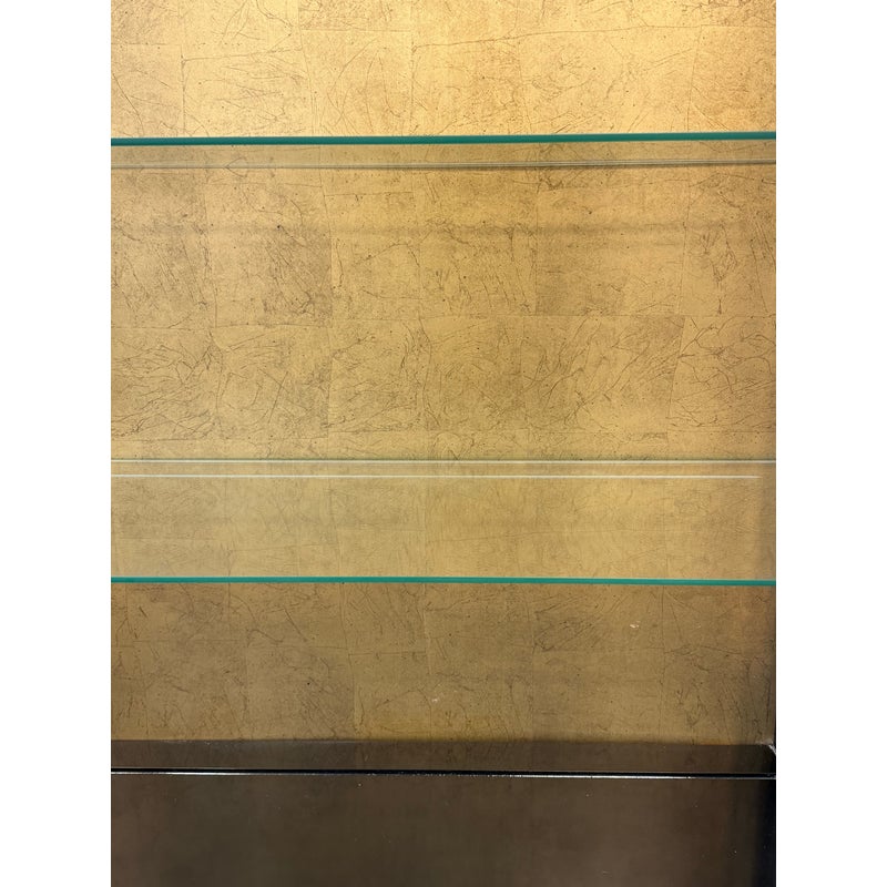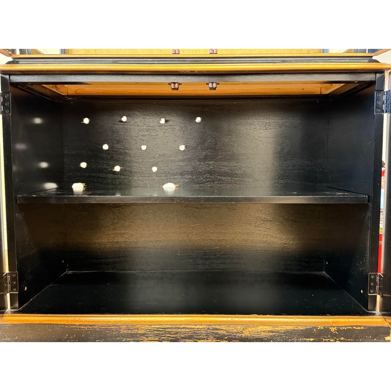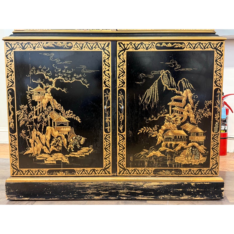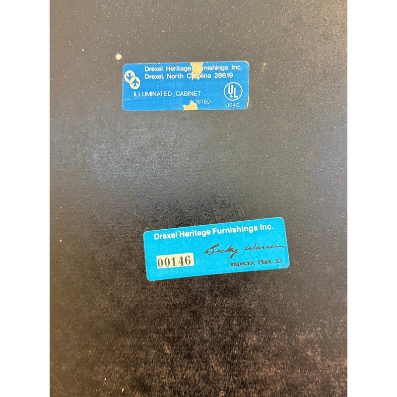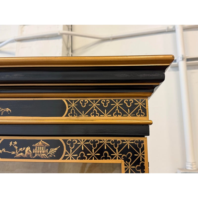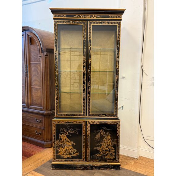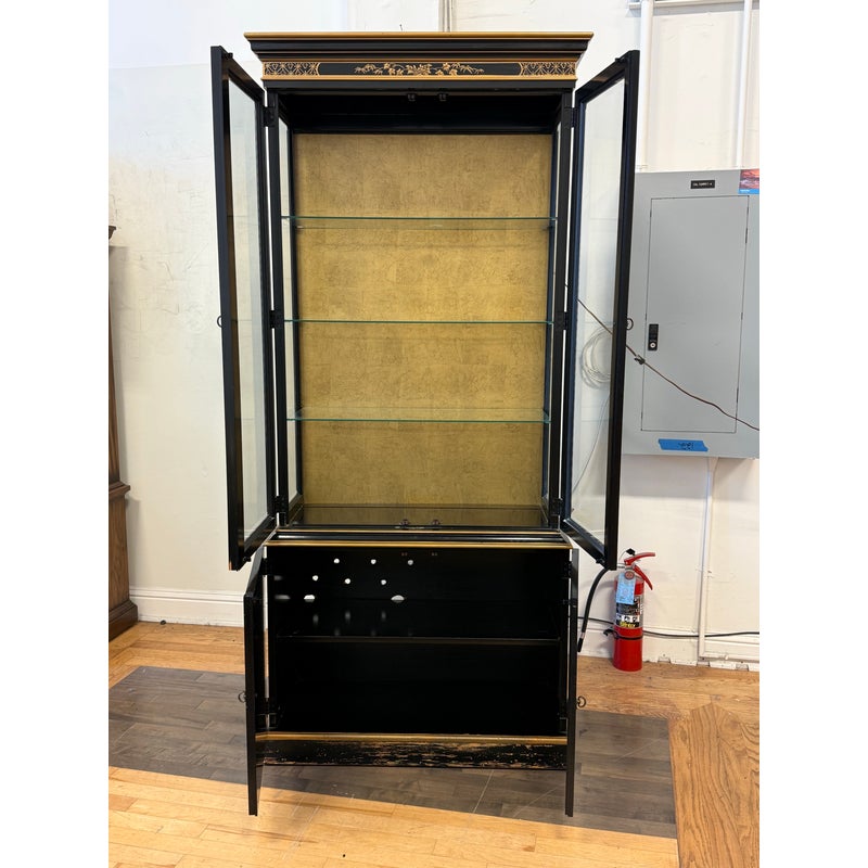 Design Plus Gallery presents a Vintage Chinoiserie Display Cabinet from Drexel Heritage. This cabinet is from renowned Et Cetera collection that was produced in the late 20th century. The cabinet is coated in a black lacquer and adorned with hand-painted gold gilt chinoiserie scenes and decorative motifs that reflect an 18th-century European interpretation of Chinese art and design. The cabinet has an upper glass display hutch and a lower two-door cabinet base that splits in two for ease of transport. Inside the hutch are three glass shelves and an illuminated interior, ideal for beautifully showcasing collectibles, china, or decorative objects. Practical details include DIY cutouts on the lower back for electronics wire passage, making this piece as functional as it is decorative. In good condition, visible and minimal wear from usage. Made in the USA.