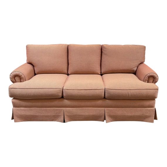 Design Plus Gallery presents the Natalie Sofa by Drexel Heritage. Classic styling includes highly rolled arms, pleased skirt and self welted details. The neutral tan fabric is woven with ruby for color and texture. Loose down back cushions and down-wrapped seat cushions create a comfortable and timeless sofa.