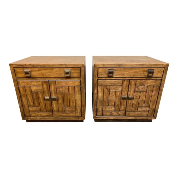 Design Plus Gallery presents a Pair of 1970’s Nightstands by Drexel Heritage. From the Woodbriar Collection. Features drawers and cubbies for all your storage needs. Made from Pecan wood with brass hardware. Made in North Carolina, USA.