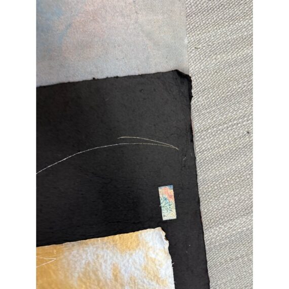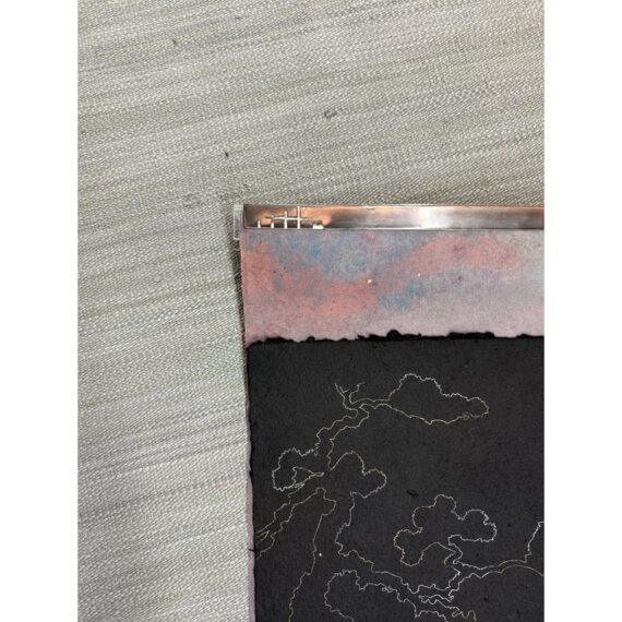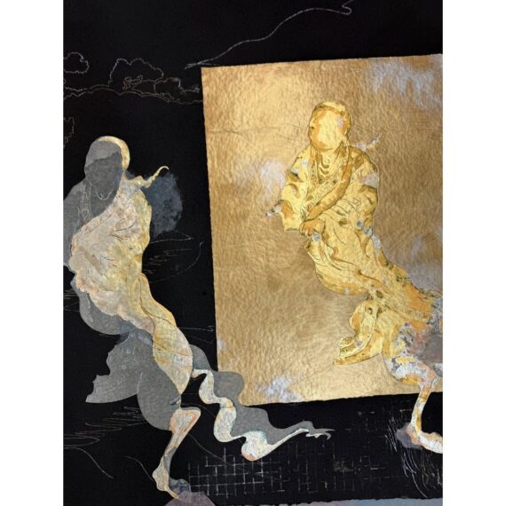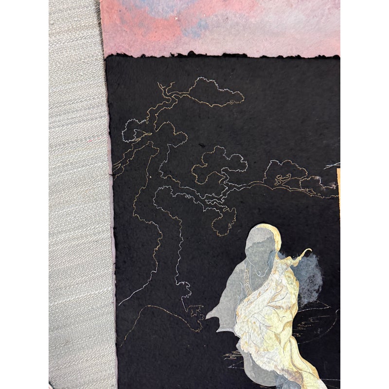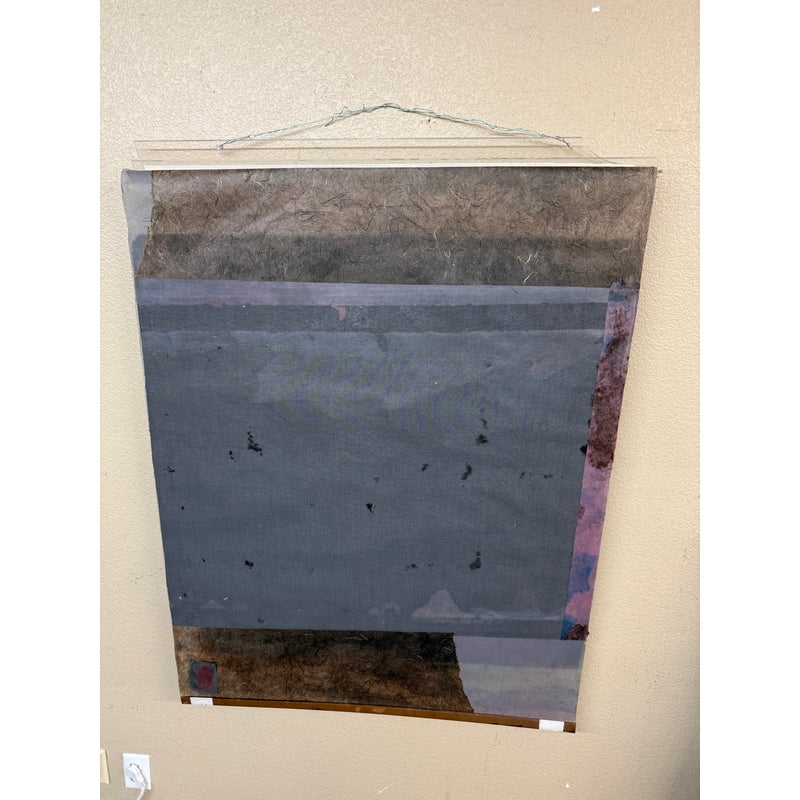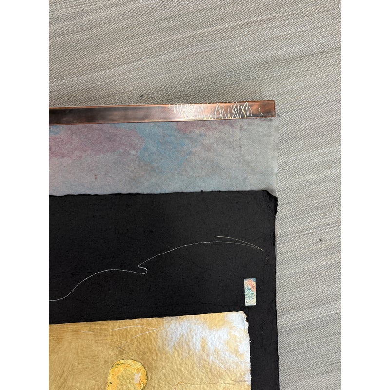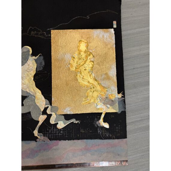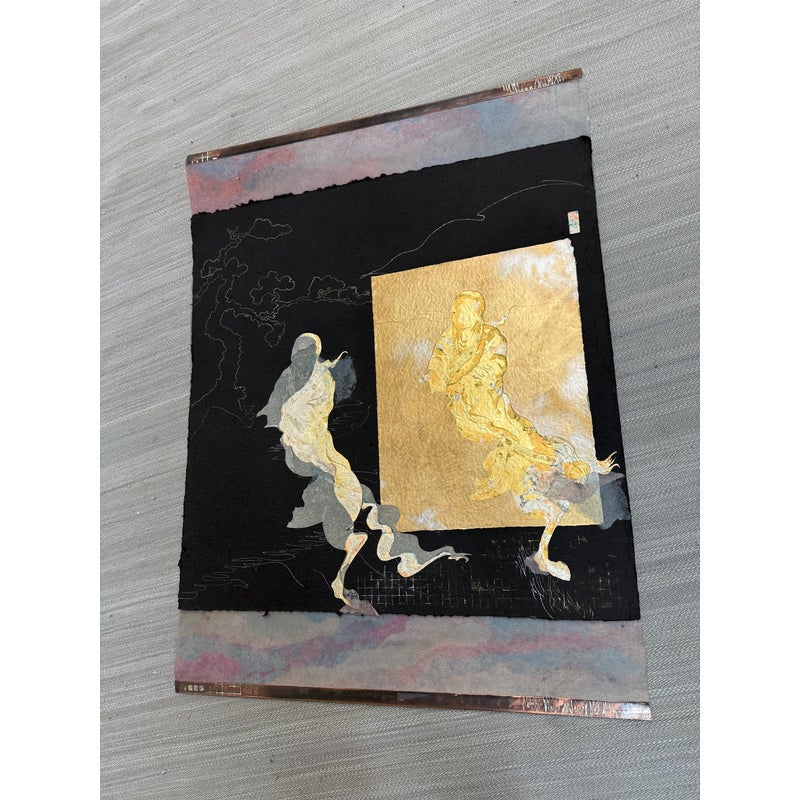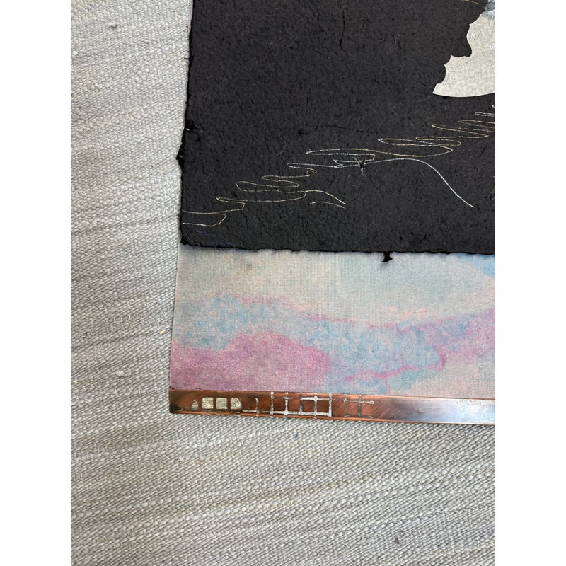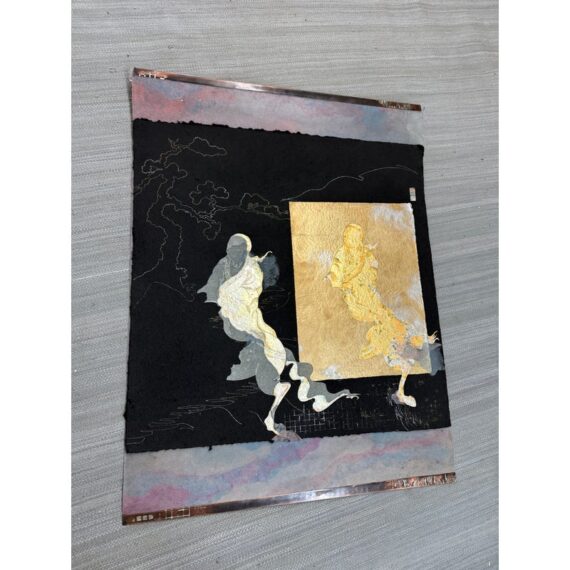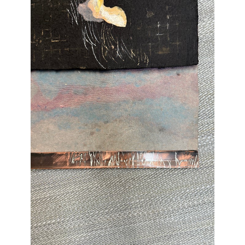 Design Plus Gallery presents “Ghost Saga” a Mixed Media piece by Dunn Meyer Gallery. Layers of paper, fiber, boards, foil and more create the compelling background for the ethereal figures trapped in space. Plexi cleat attached at top of art piece for use with wall cleat (not included); or install with wire. Little wear; condition is good.