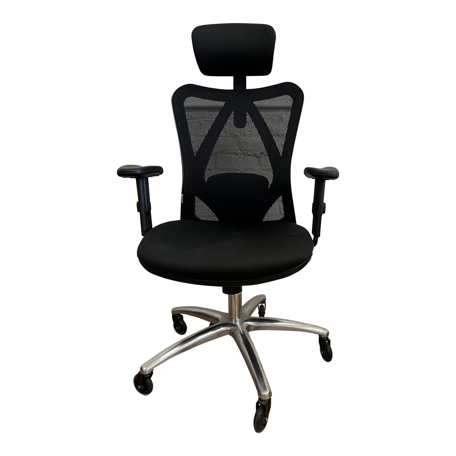 Design Plus Gallery presents an Ergonometric Office Chair by Duramont. This is an adjustable desk chair with lumbar support. There is a high back with breathable mesh back rest. Thick cushioning and padding to sit upon. Rollerblade wheels to glide easily with a 360 swivel seat. Chair is in good condition with wear on the base but would be considered consistent with age + use.