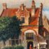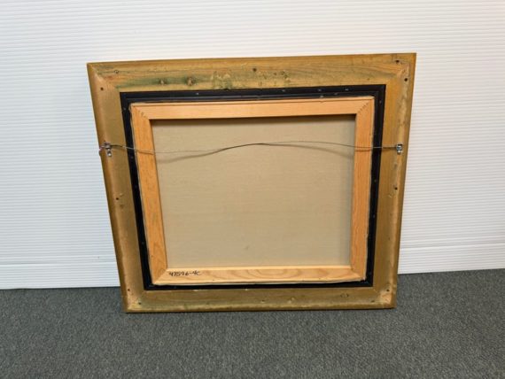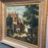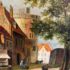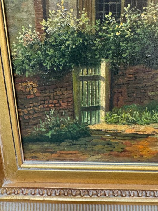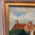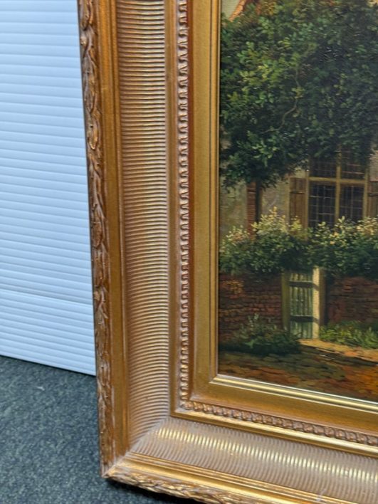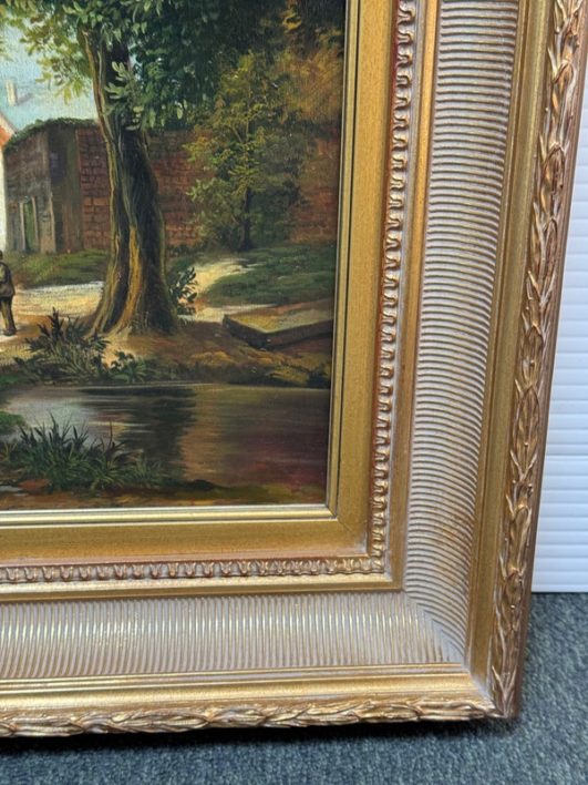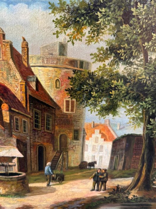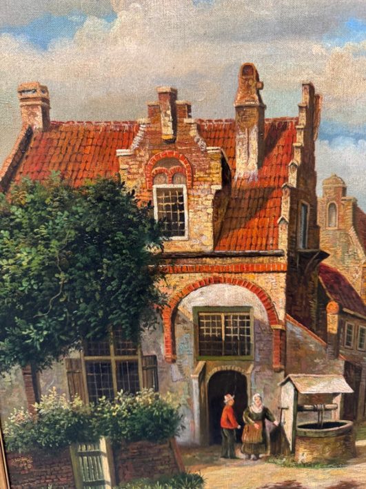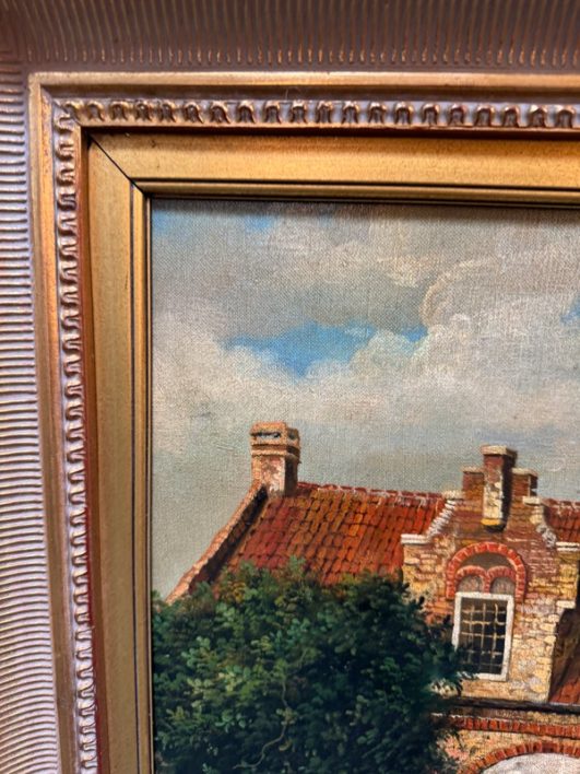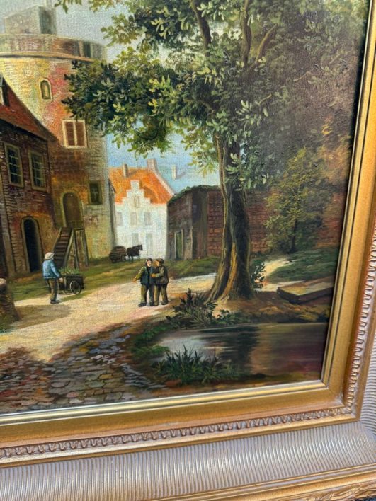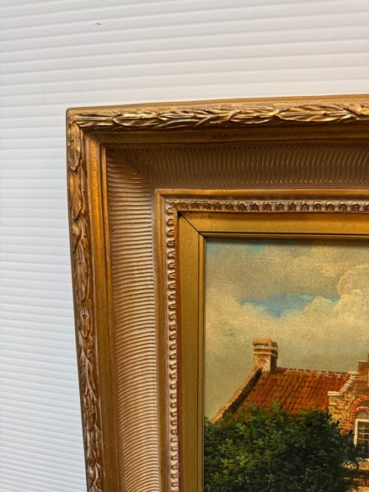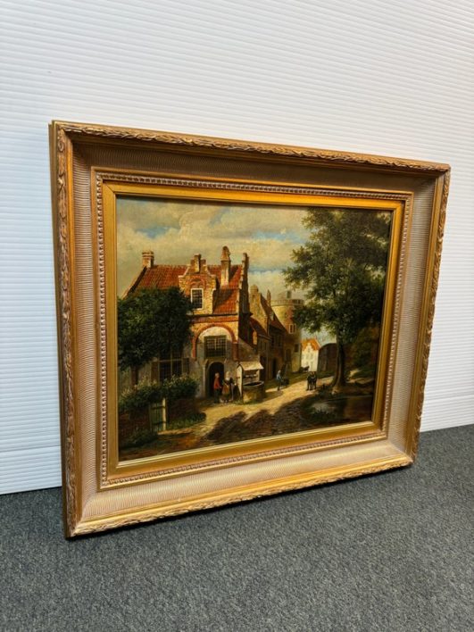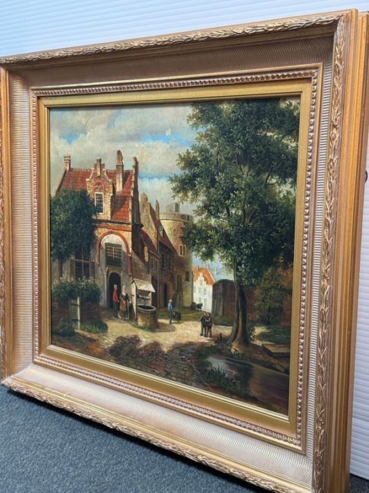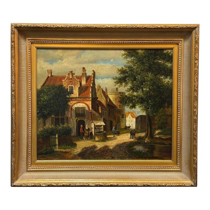 Design Plus Gallery presents an Original Artwork of a Dutch Village Scene. Custom Gold Frame. The town of red roofs on a harmonious tree lined street, is bustling with the town’s inhabitants. The artwork is in good condition; signature is hidden by carved gilt wood frame.