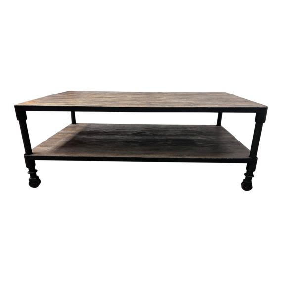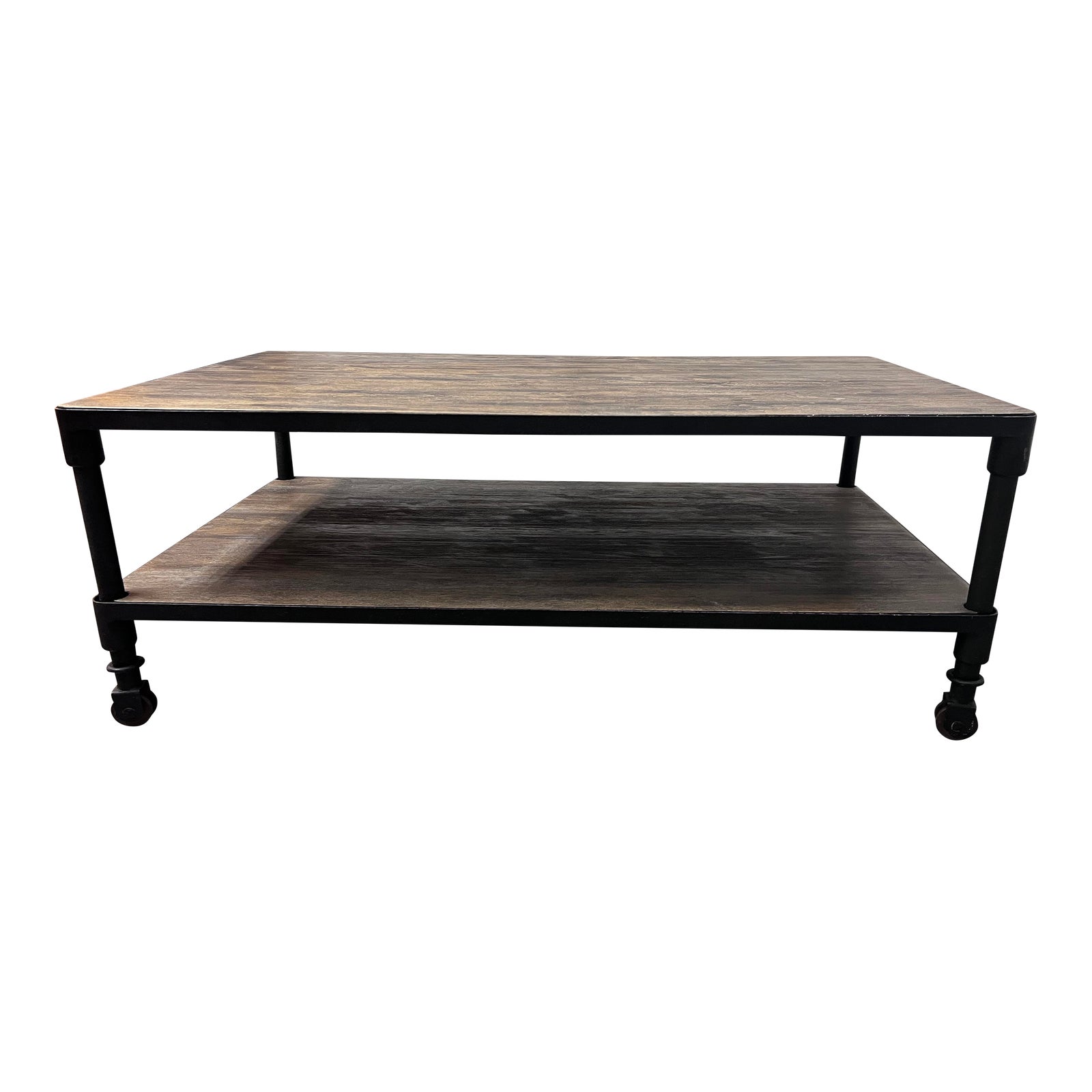 Design Plus Gallery presents a Wood Plank Double Tiered Coffee Table from E & E Company. The table has all the air of industrial toughness with a stylized design aesthetic. The table is on casters, use of reclaimed wood and tough as nails look & feel of steel. The table has visible signs of distress however with its style is in good condition.