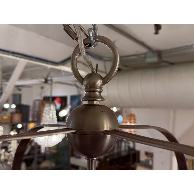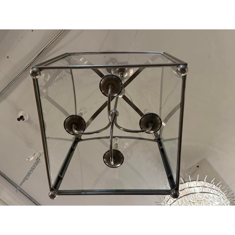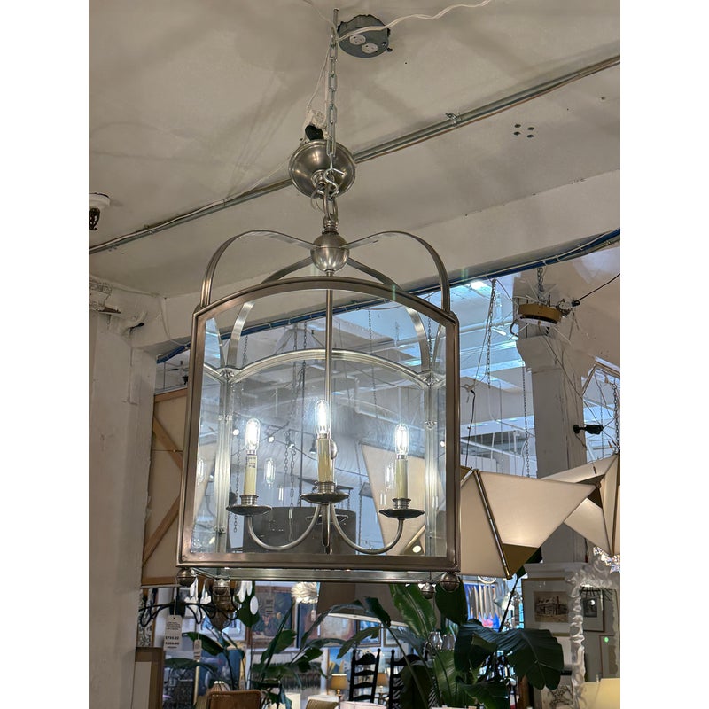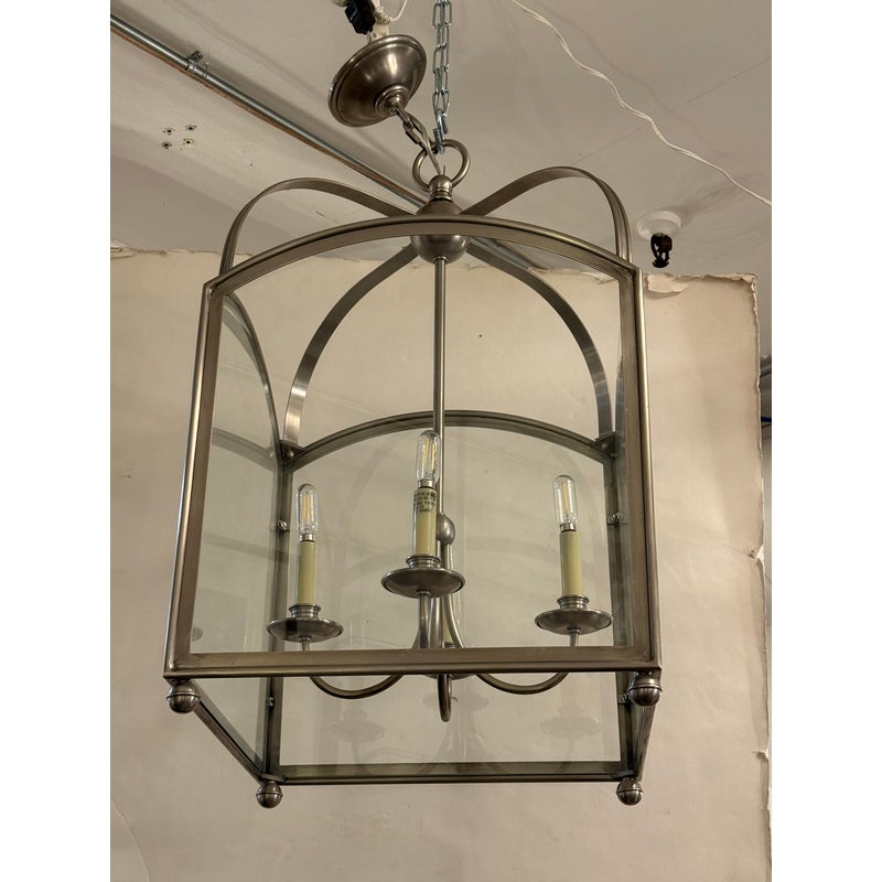 Design Plus Gallery presents the Arch Top Lantern Pendant by E.F. Chapman for Visual Comfort Signature. This is what we call a classic lighting form interpreted through a tailored architectural silhouette. This lantern pendant is defined by its arching metal framework and clear glass panels, allowing the internal structure to remain fully visible while providing an open, airy presence. Suspended by a chain, the pendant houses a four-light candelabra arrangement that delivers balanced illumination. The structured geometry and proportional lines make it adaptable to both traditional and transitional interiors, while the exposed glass enclosure enhances light distribution without obstruction. Designed by E.F. Chapman for Visual Comfort Signature collection makes a versatile statement fixture for a variety of settings. In good condition, visible and minimal wear from usage.
