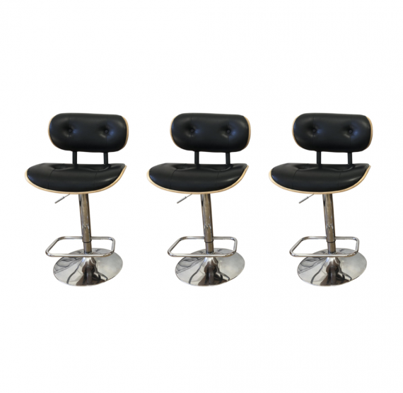 Design Plus Gallery presents a pari of Eames Molded Style Barstools. This stool is complemented with a comfortable black vinyl padded seat pad and a height adjustable swivel seat that adjusts from counter to bar height with the handle located below the seat. The base and footrest have a chrome finish to complement the chair’s modern design.