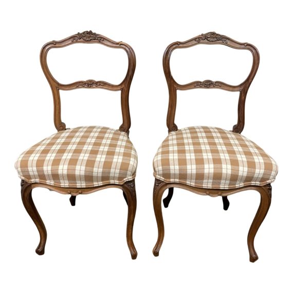 Design Plus Gallery presents an Early 20th Century Antique French Carved Chair. Wood frame has beautifully ornate carvings of botanical motifs through out the curved and light frame. Fixed seat is newly upholstered with a double welted spring fabrication. Fabric is a tan and ivory plaid. Minor wear.