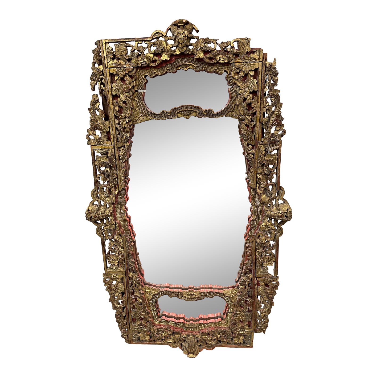 Design Plus Gallery presents an Early 20th Century Asian Influenced Gold Gilt Panel Mirror. Repurposed from an architectural detail with a Wedding daybed. Intricate botanical carvings adorn the large center panel and the smaller side panels. Wood is adorned with a gold gilt finish and interior shows a light red tone. Visible wear through out, good condition overall. Back has been updated with a ply board panel and two D Rings which run length wise. Ornate and old world style would make a luxe statement in a bathroom or a dining room.