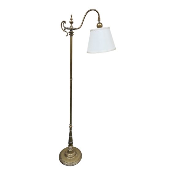 Design Plus Gallery presents a Antique Brass Floor Lamp. Slender and turned forms are cast with brass for an Art Nouveau silhouette. The ball head fabric shade is adjustable with a drop chain. There is minor wear through out, floor lamp is in good condition.