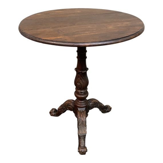 Design Plus Gallery presents an Early 20th Century Cabriole Three Leg Pedestal Side Table. French provincial base is beautifully carved with intricate scroll work and curves. Solid oak is joined with mortise and tenon craftsmanship. Wood is stained a rich chestnut tone. Some visible wear from age, good condition.