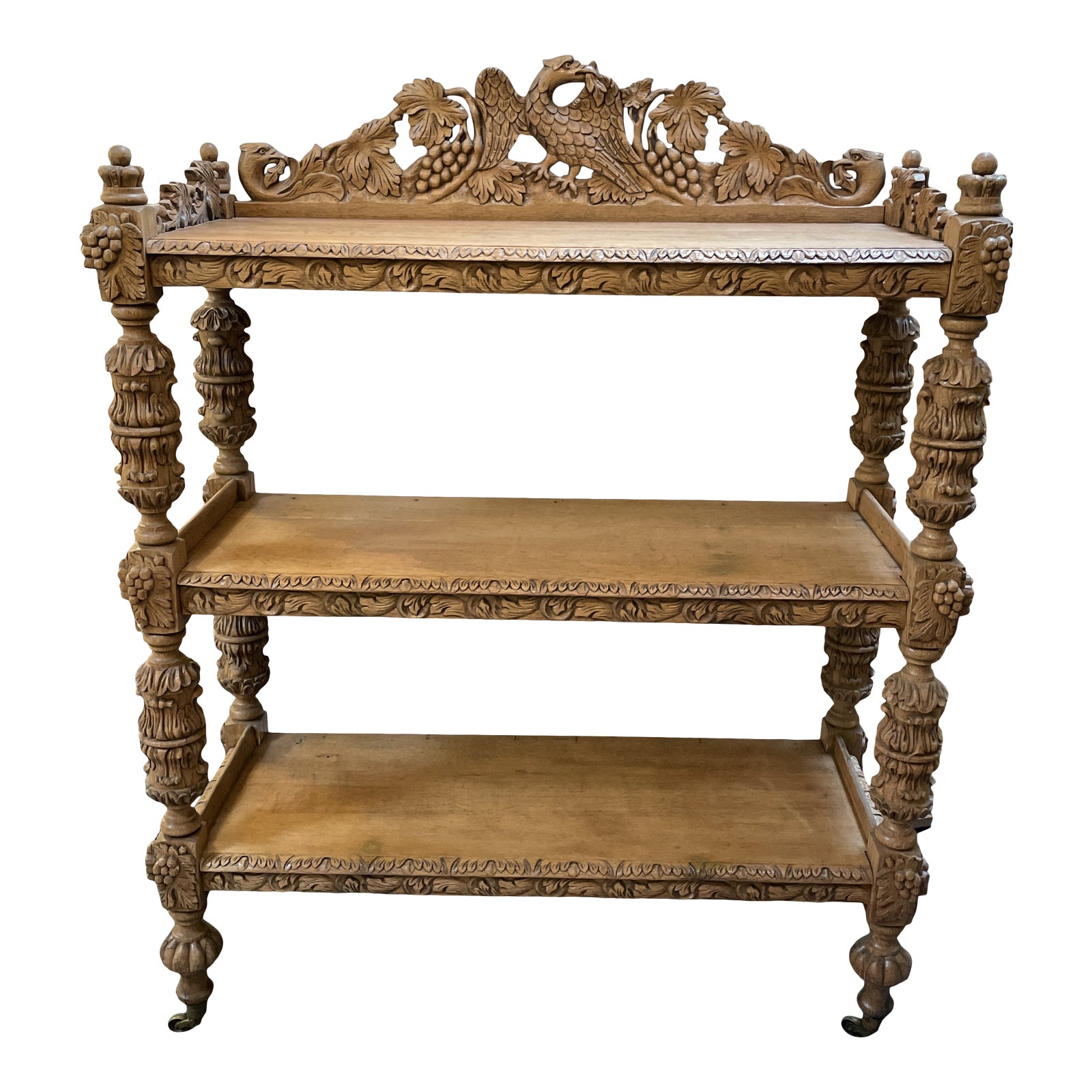 Design Plus Gallery presents a Vintage Wood Etagere. Completely unique, the intricately carved shelving depicts eagles, grape cluster and leaves on nearly every surface. Deep, wide plank shelves have had small plain wood braces added to keep valuables from sliding off (see photos). Gorgeous carved feet end in antique brass casters.