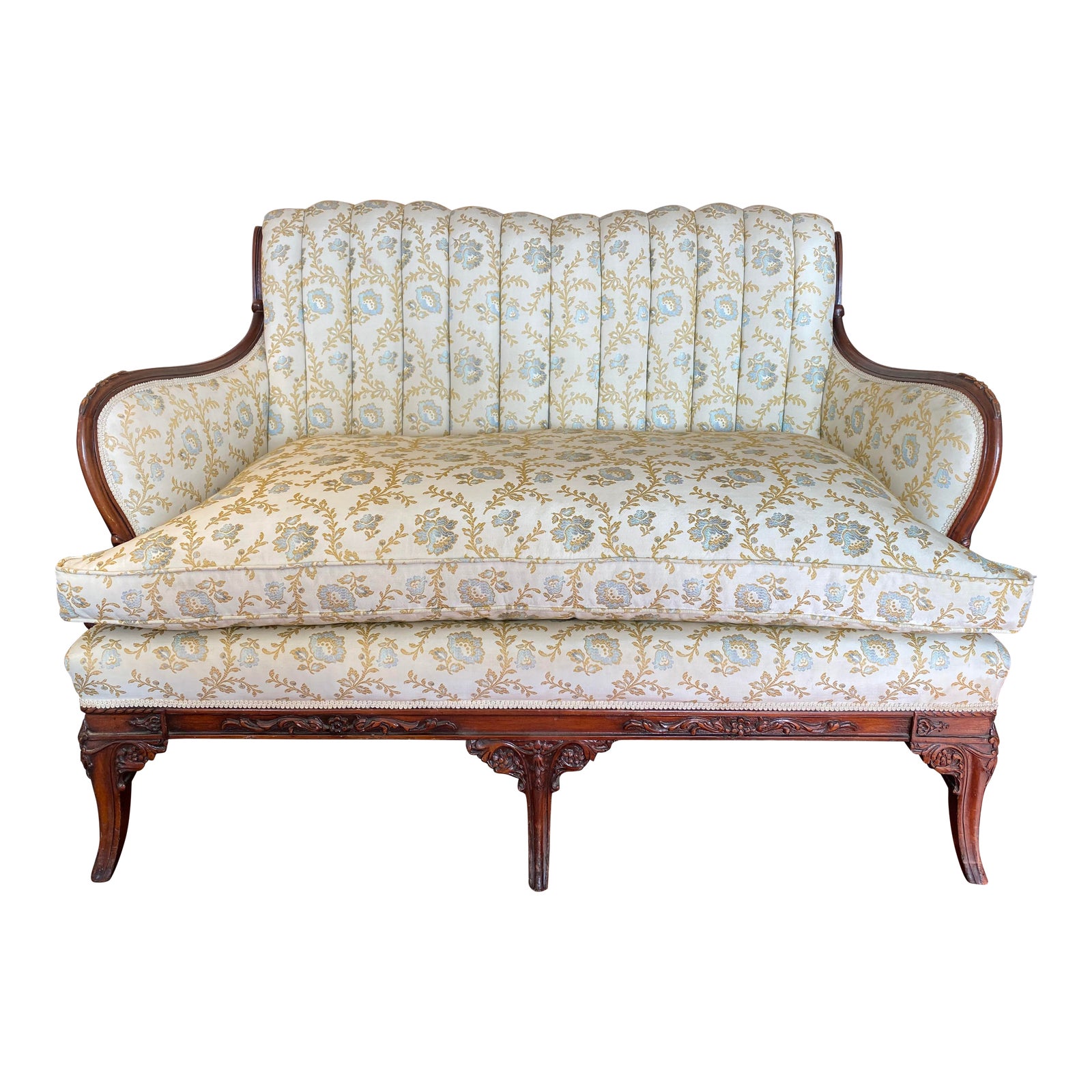 Design Plus Gallery presents a Early-20th Century Settee. Fabric is an embroidered floral pattern with champagne and blue tones on an ivory background. Bench seat is filled with a down insert while back has a firm construction with a fixed backed. Rich chestnut stain on the wood frame contrasts the upholstery. Minor wear on surfaces. Wood is adorned with botanical motifs.