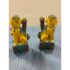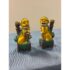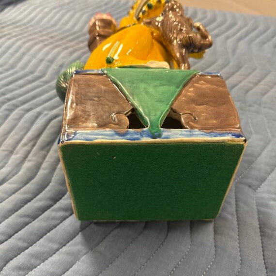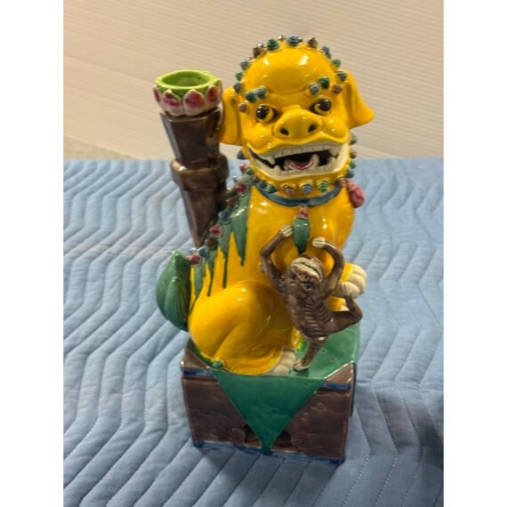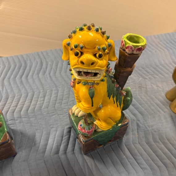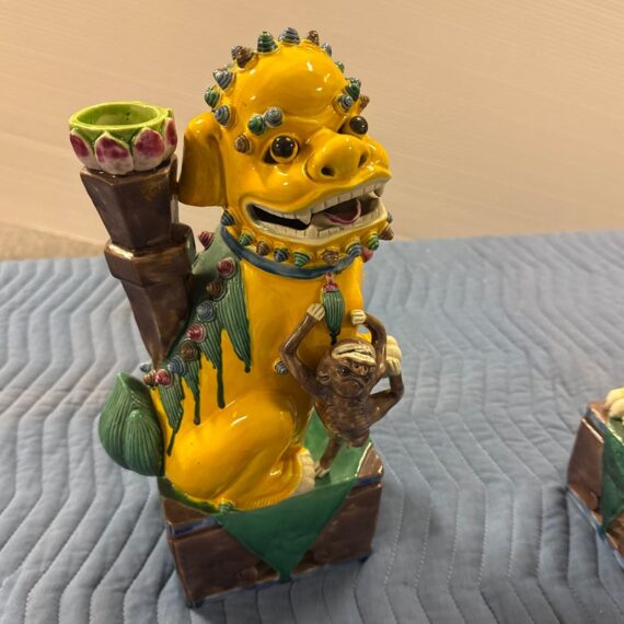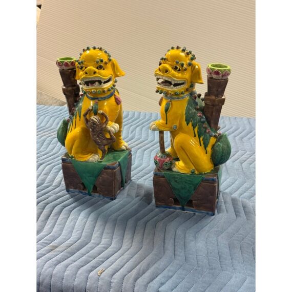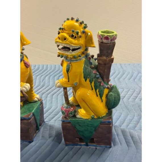Design Plus Gallery presents a Set of Two Foo Dogs from the Early 20th Century China. The set shows the nearly identical dogs standing on a podium and made from ceramic. They have vibrant paint tones of yellow, green, blue, red and brown throughout. These food dogs are meant to offer protection in the home and do well placed by doorways of entry. Both are in good condition with visible wear that is consistent with their vintage age.