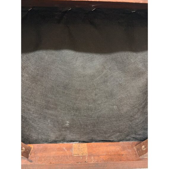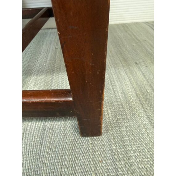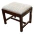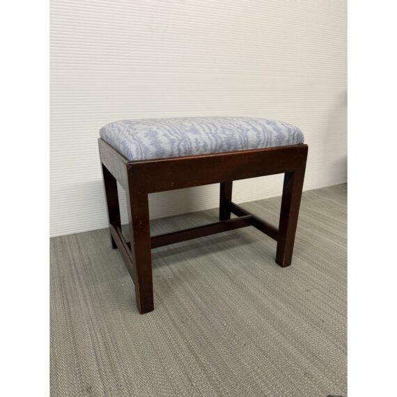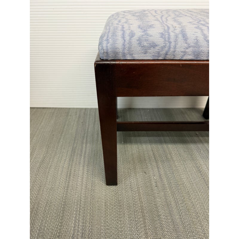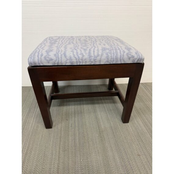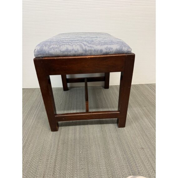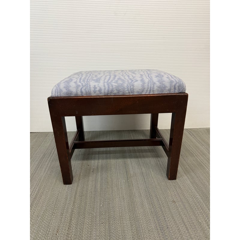 Design Plus Gallery presents an Early 20th Century Chippendale Footstool. The dark finish wood compliments the baby blue and violet faux bois seat upholstery. The mortise and tenon joint fittings make the foot stool extremely durable. Seat cushion is removable. In good condition, visible and minimal wear from age.