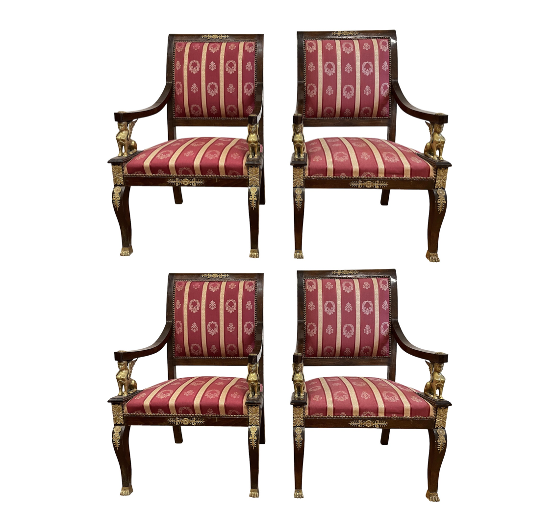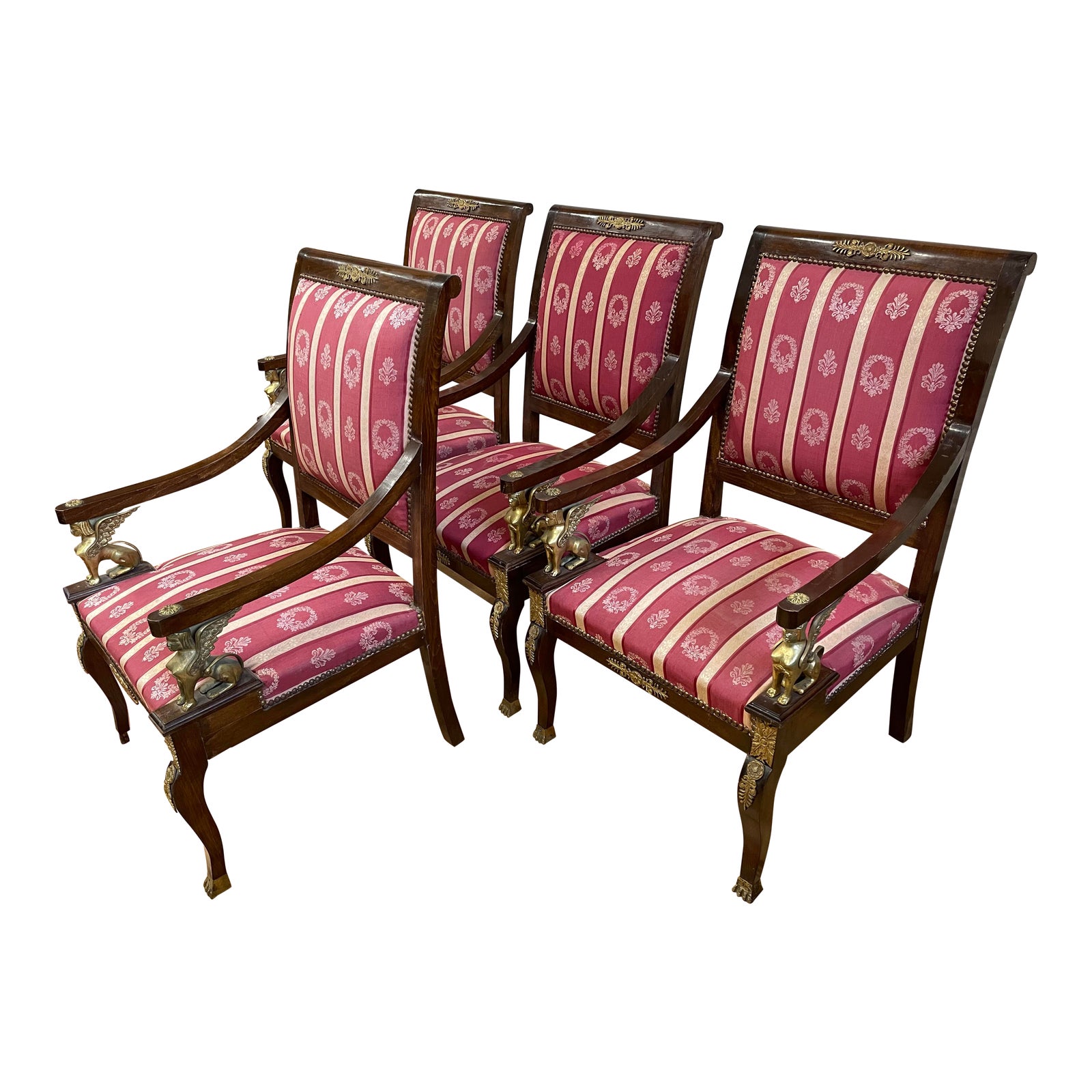 Design Plus Gallery presents a Set of Four Early 20th-Century Empire Brass Sphinx + Wood Arm Chair. Sleigh back frame with ornate wood and brass detailing showcases sphinx brass forms under each arm. Fabric shows wear and could use reupholstery. Front legs are capped with brass feet, one of the chairs is missing a a back corner leg
