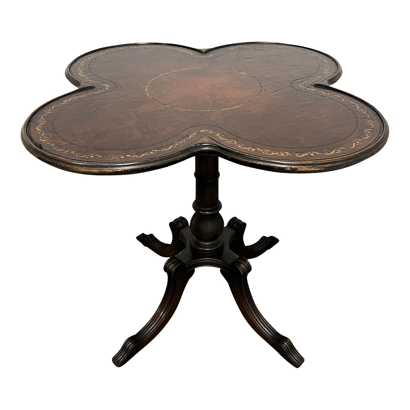 Design Plus Gallery presents an Antique Quatrefoil Wood + Leather Side Table. The table is constructed almost entirely with wood. The quatrefoil top features leather that was handprinted. Elaborate accenting was added near the edges in a gold color, with a matching circle accent in the center. The pedestal base has four legs, each with inward curves and symmetrical rib accents running parallel to the long edges. The pedestal body is a round pillar with a rounded accent near the pedestal legs. Minor wear from age and use; table is in good condition.