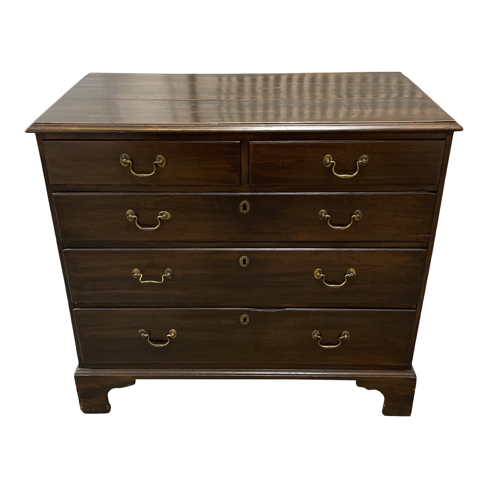 Design Plus Gallery presents a Early 20th Century Five Drawer Wood + Brass Chest. A light pine wood is constructed with dovetail joinery in this warm and inciting dresser. Original key is missing and some of the pulls a warped. Small scale unit boasts plenty of vintage charm and can be positioned bed side or as accent storage in main living spaces. Visible wear due to age and usage.