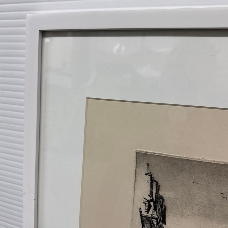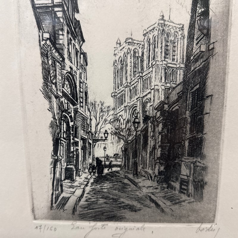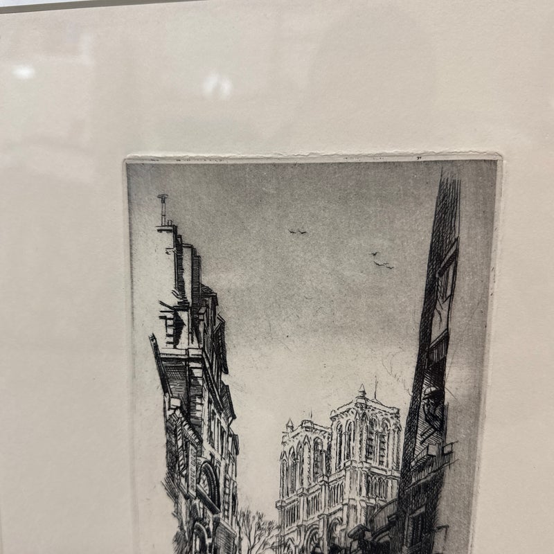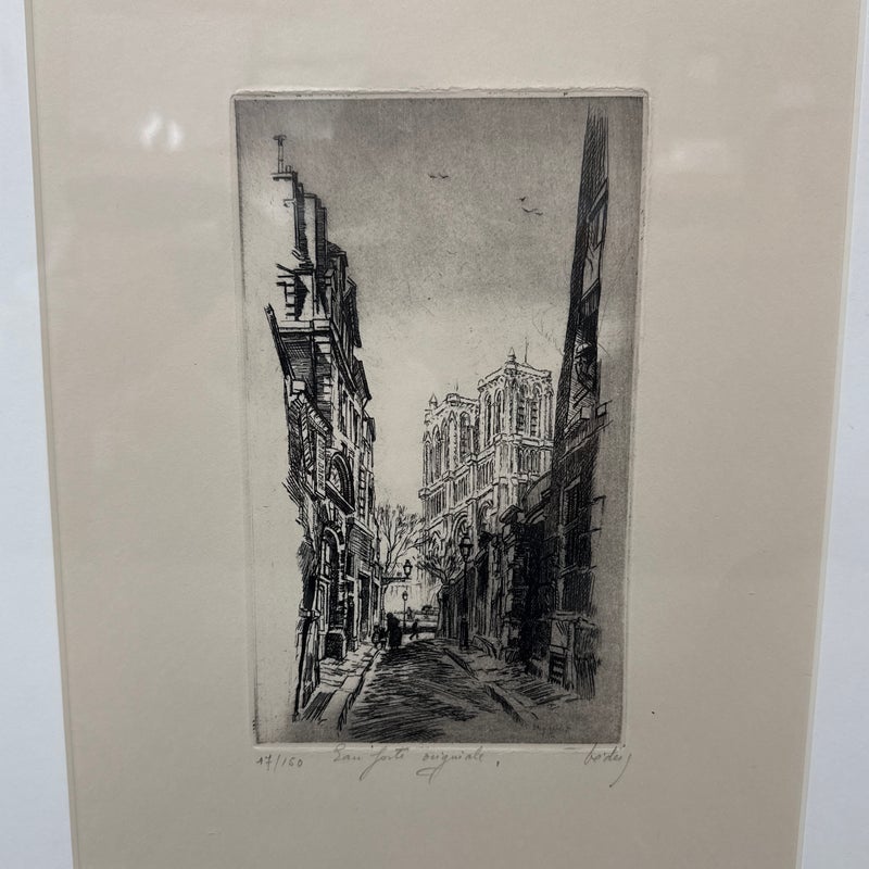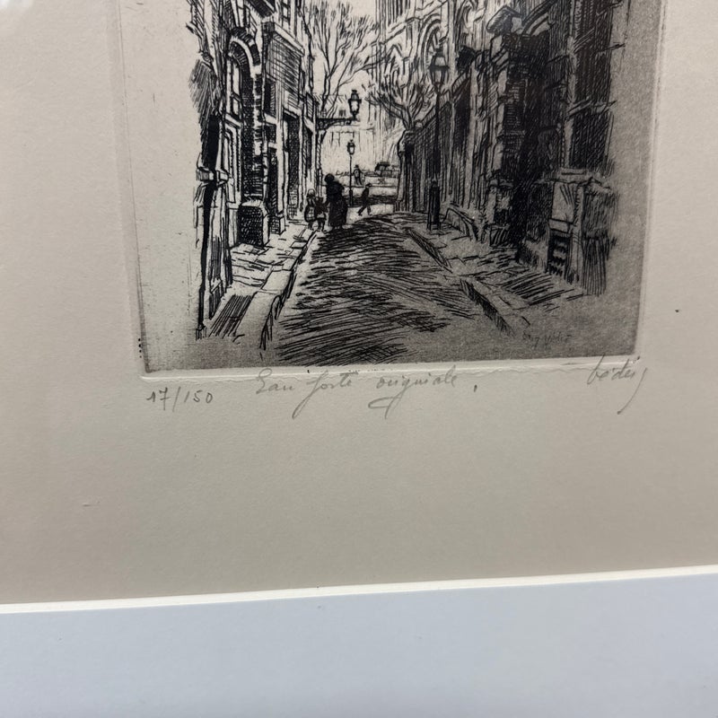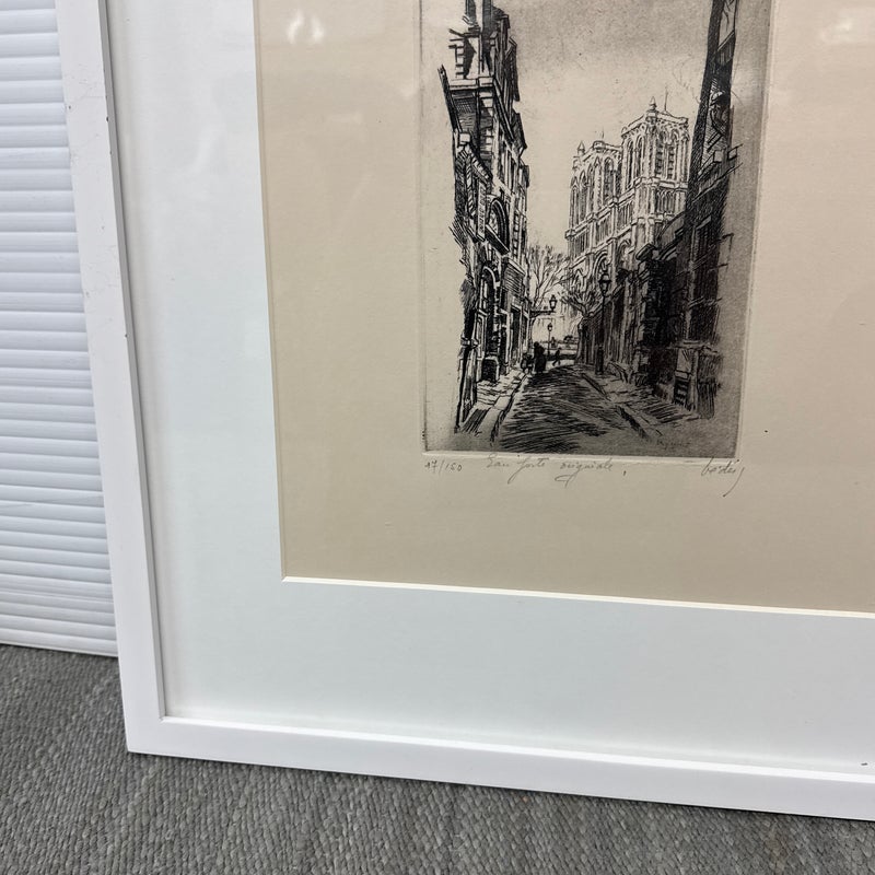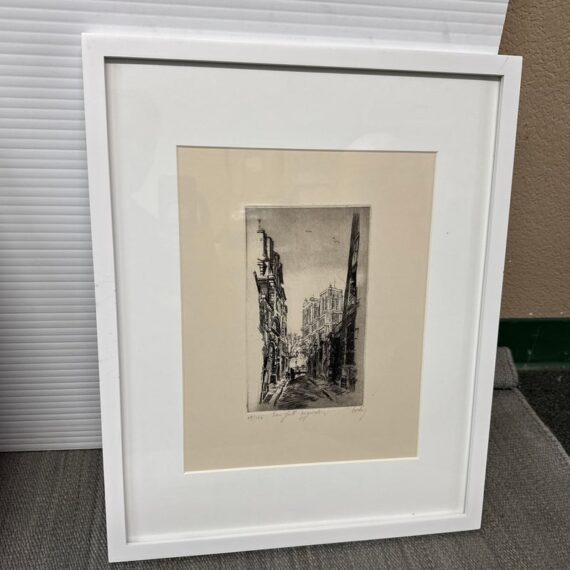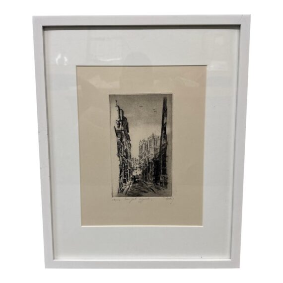 Design Plus Gallery presents an Engraving from a French School of a Landmark Street. The piece is professionally framed in stark white with a white matte that has the paper of antique age really stand out. The ecru paper has a black etching finely done with studied technique of a street in Paris. It is signed and numbered 17 of 150. It is in good condition for its age + use with minimal visible wear.