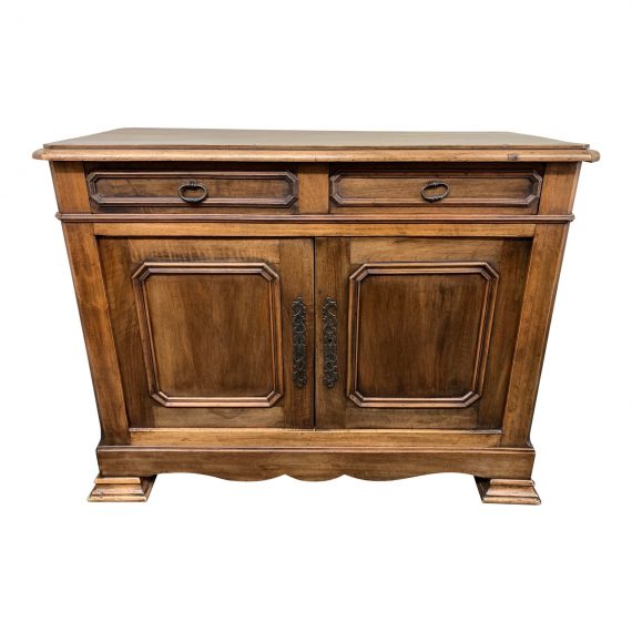 Design Plus Gallery presents a Early-20th Century French Style Sideboard. French inspired moldings + oiled brass hardware give an old world feel to the walnut stained oak storage unit. Comes with key to lock the doors bellow. Visible wear on surfaces give a distressed vintage look. Drawers on top add convenient storage.