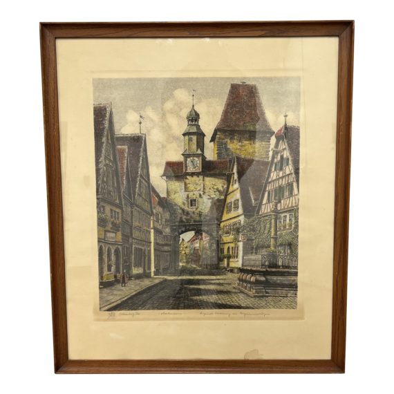 Design Plus Gallery presents an Early 20th Century German Hand Colored Lithograph “Clocktower #3.” Charming etching shows a German city in incredible precision. Setting is further enhanced with hand coloring on the sun’s light, thatch rooftops and foliage. There is a signature and title at the footer of the print along with a stamp. There is minor wear through out, lithograph is in good condition.