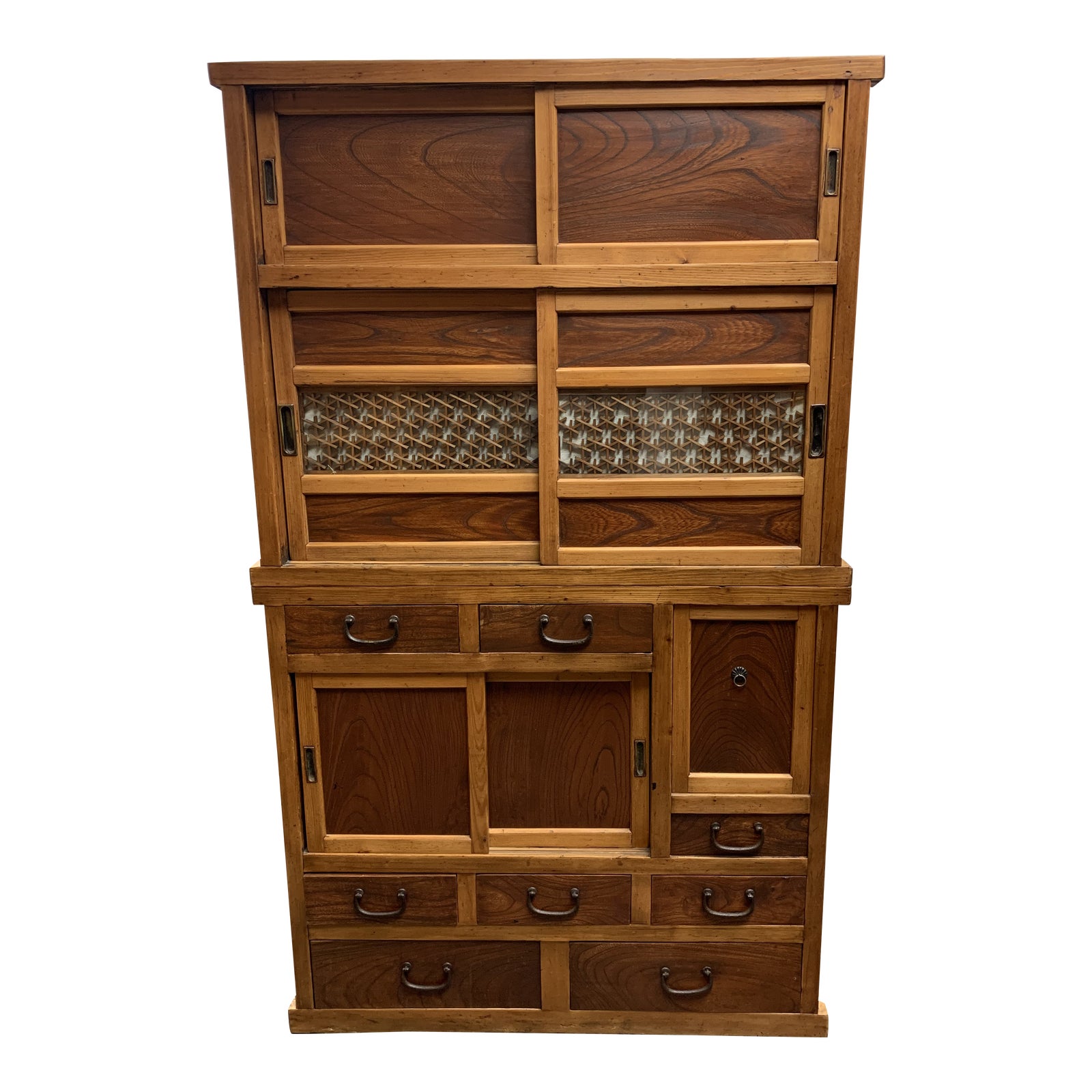 Design Plus Gallery presents a Japanese Early-20th Century Mizuya Tansu. Wood is beautifully contrasted within each compartment + accented with oiled brass hardware. Wood combination consists of Dark Pine, Cedar, Keyaki, + Cypress. Modular formation can be stacked one on top of the other or side by side. Interiors based are fixed with white liner. Clear glass in the largest compartment showcases fretwork with a rice paper backing to add a unique layer of interest. Paper is adhered and could use further attachment for longevity.