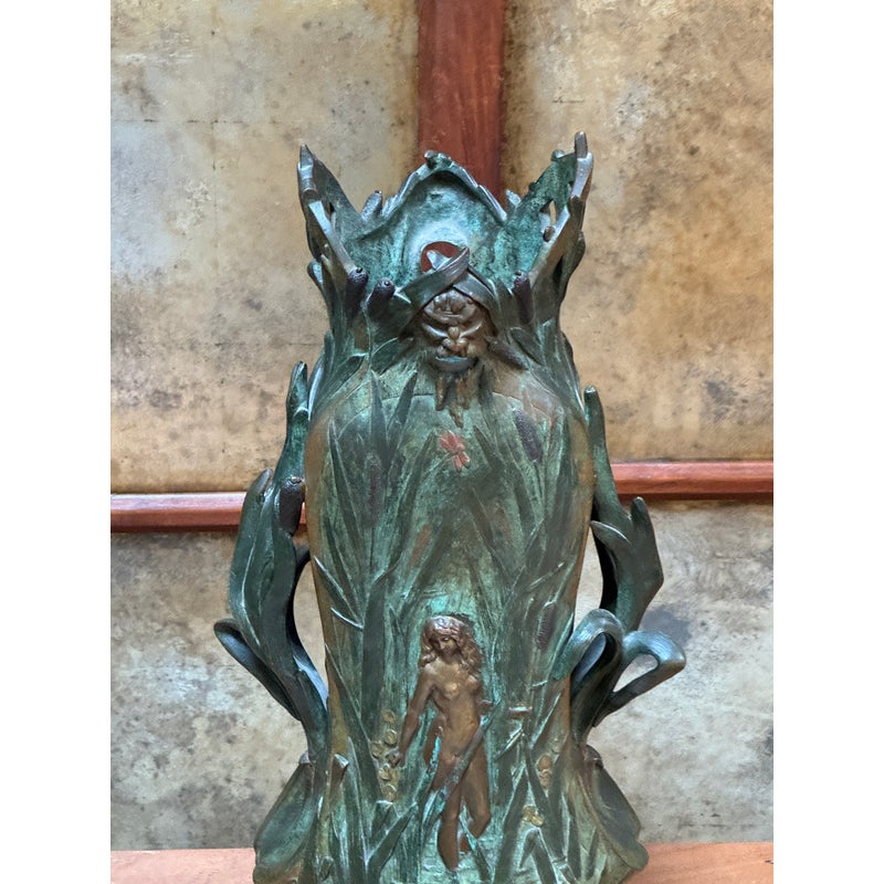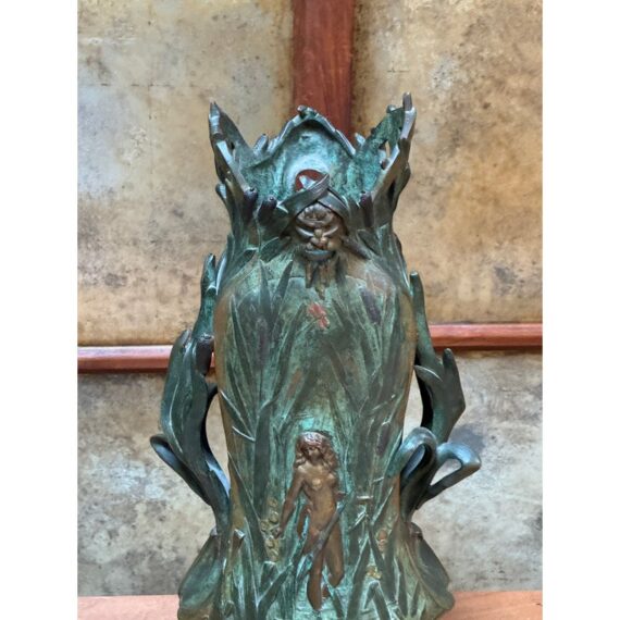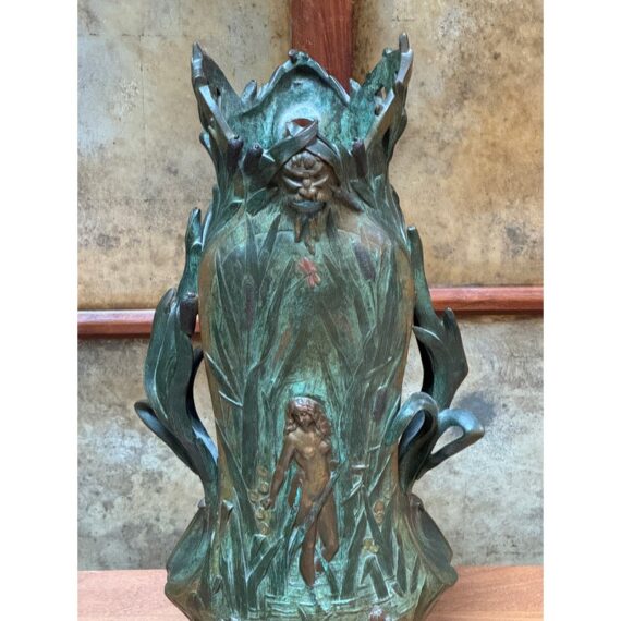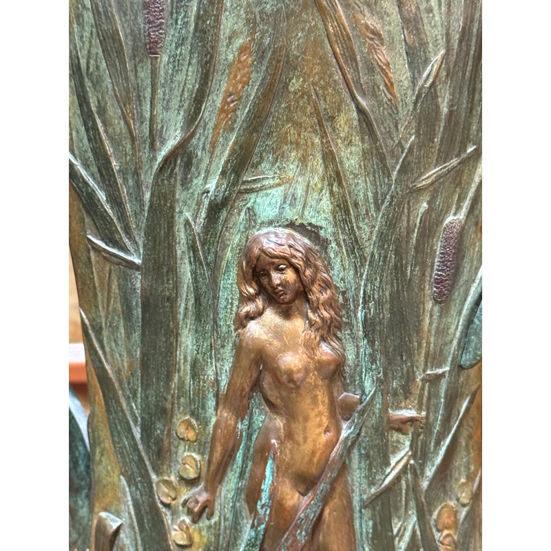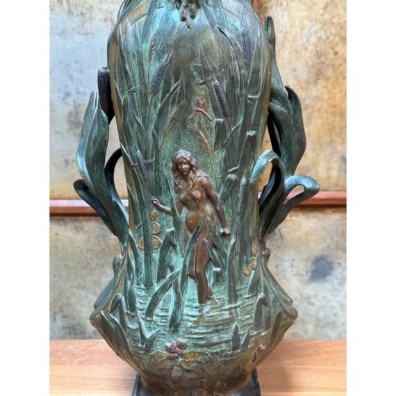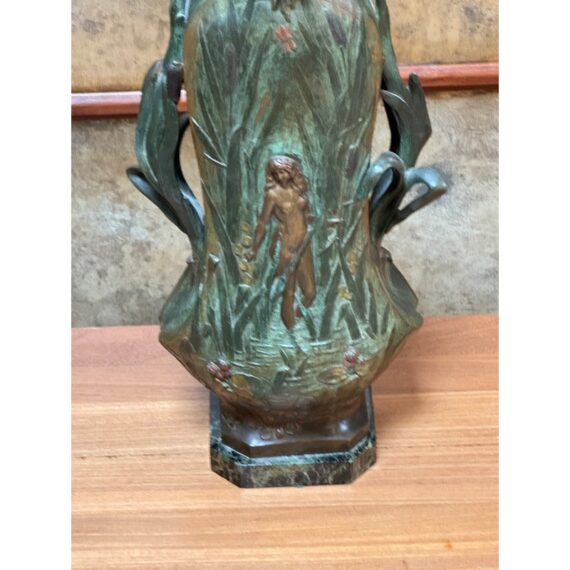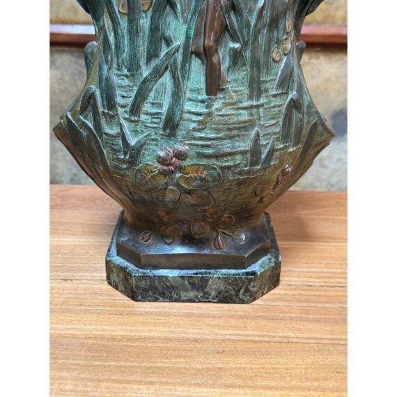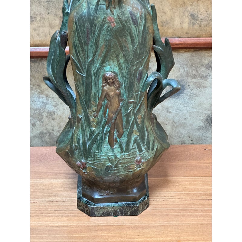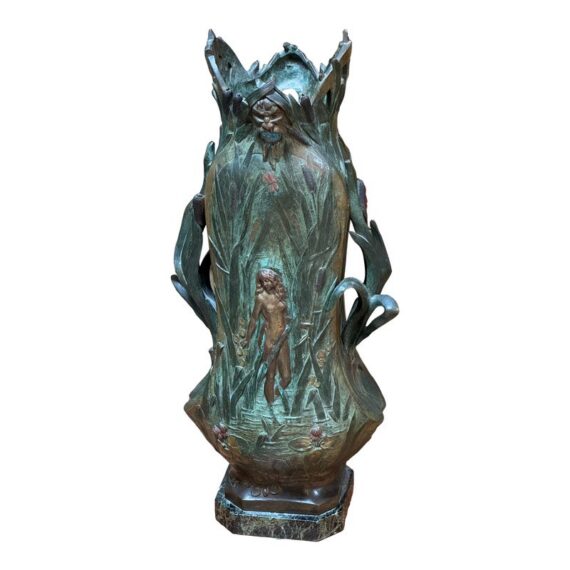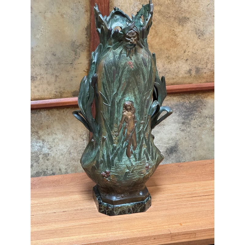Design Plus Gallery presents an Art Nouveau Sculpted Vase by Louis Ouvet (d.1920). Ouvet was a French sculptor known for Art Nouveau and Symbolist bronze, often chryselephantine, figures. He is associated with the 1900s artistic movement in France with this vessel being a pure representation of his capabilities. The vessel rests on a green marble base and has a body of oxidized iron. The overall appearance of this seems as if a a nude female figure is coming out of a gully, or dense packed watery land. She is brighter with her brass tone gleaming out of the green and true artistic presence is amassed. The dimensions qualities show with her the wading through water in a land of dragonflies, pussy willows, and folding palms The imagery is two sided with similar scenes and a different female nude form. The artists signature is on the base and the sculpture is in good condition.