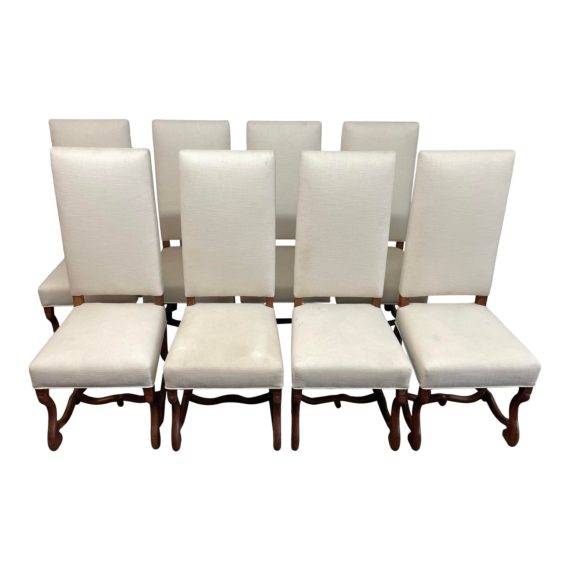 Design Plus Gallery presents a Set of Eight Louis XIII Style Os De Mouton Dining Chairs. This is a beautiful set of chairs, circa 1920’s. Sinuous carved oak frames each chair seat and back. Professionally rebuilt and upholstered in a neutral, off-white linen weave cotton-blend fabric with antiqued brass nailhead trim. Original Upholstery replaced. Soil marks on the seat cushion; light stain on one back as shown. All eight chairs are armless.