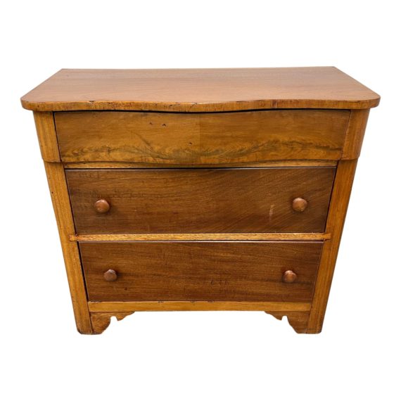 Design Plus Gallery presents an Early 20th Century Maple Three Drawer Dresser. Charming unit is scaled for a variety of applications and space not to overwhelm. Three dovetail drawers line the center with double pulls made from maple for the bottom two. Top drawer is curved to the silhouette of the top with pillar like sides which terminate into the base + curved corbels. Top is protected with a piece of glass. Minor wear through out (pictured), dresser is in good condition.