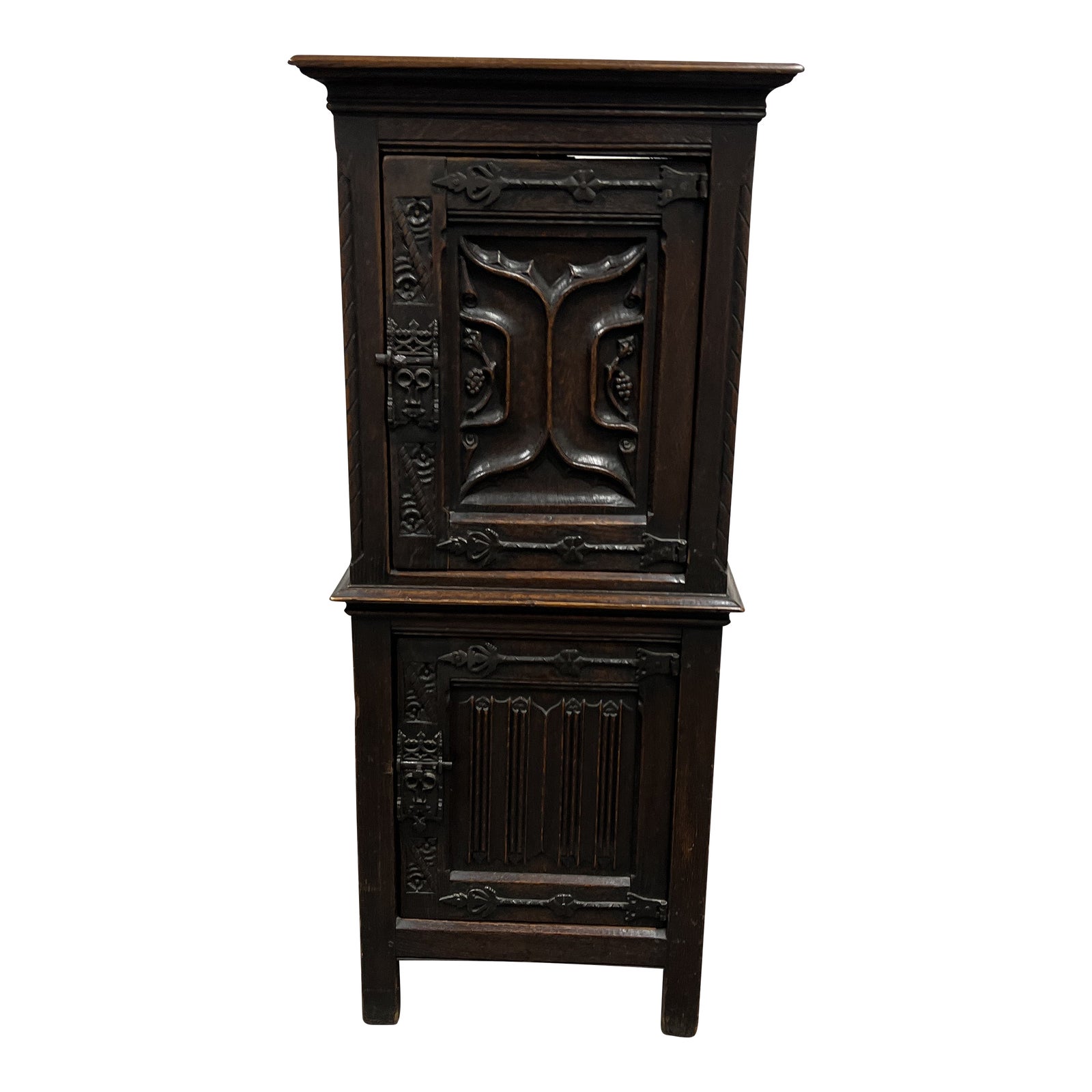Design Plus Gallery presents an Early 20th Century Neo-Gothic Tudor-Style Cabinet. Botanical and forest carved motifs adorn the cabinet doors. Top cabinet is a larger than the lower space. Solid oak frame is stained a rich umber tone. There is visible wear through out, unit is in good condition.