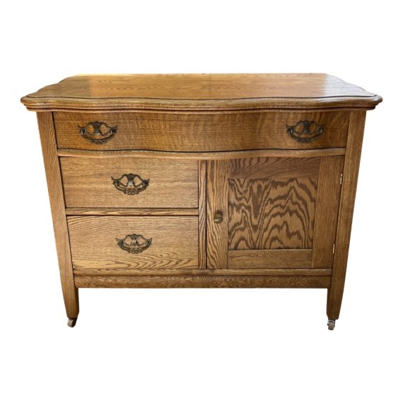 Design Plus Gallery presents a Early 20th Century Oak Wash Basin Cabinet + Drawers. Oak veneers and solid frame showcase the elegant grain of the oak wood. Feet stand atop small castors and drawers are adorned with Art Nouveau inspired oiled brass hardware. Visible wear through out, unit is in good condition. Top drawer and surfaces have an elegant bombe like curvature.