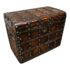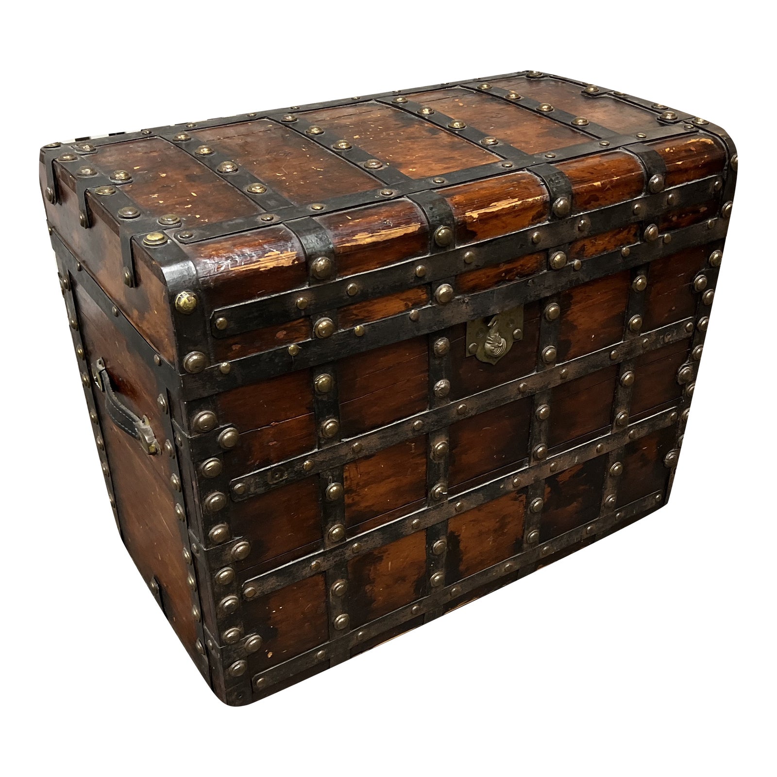 Design Plus Gallery presents an Early 20th Century Oiled Brass Nail Head Trunk. Custom made in Kentucky Louisville. There is a heavy time loved patina through out. Chest is in good condition. The original key is missing. Wood chest is lined with an wrought iron grid with oiled brass nail heads. Chests opens to reveal two trays with portraits inside.