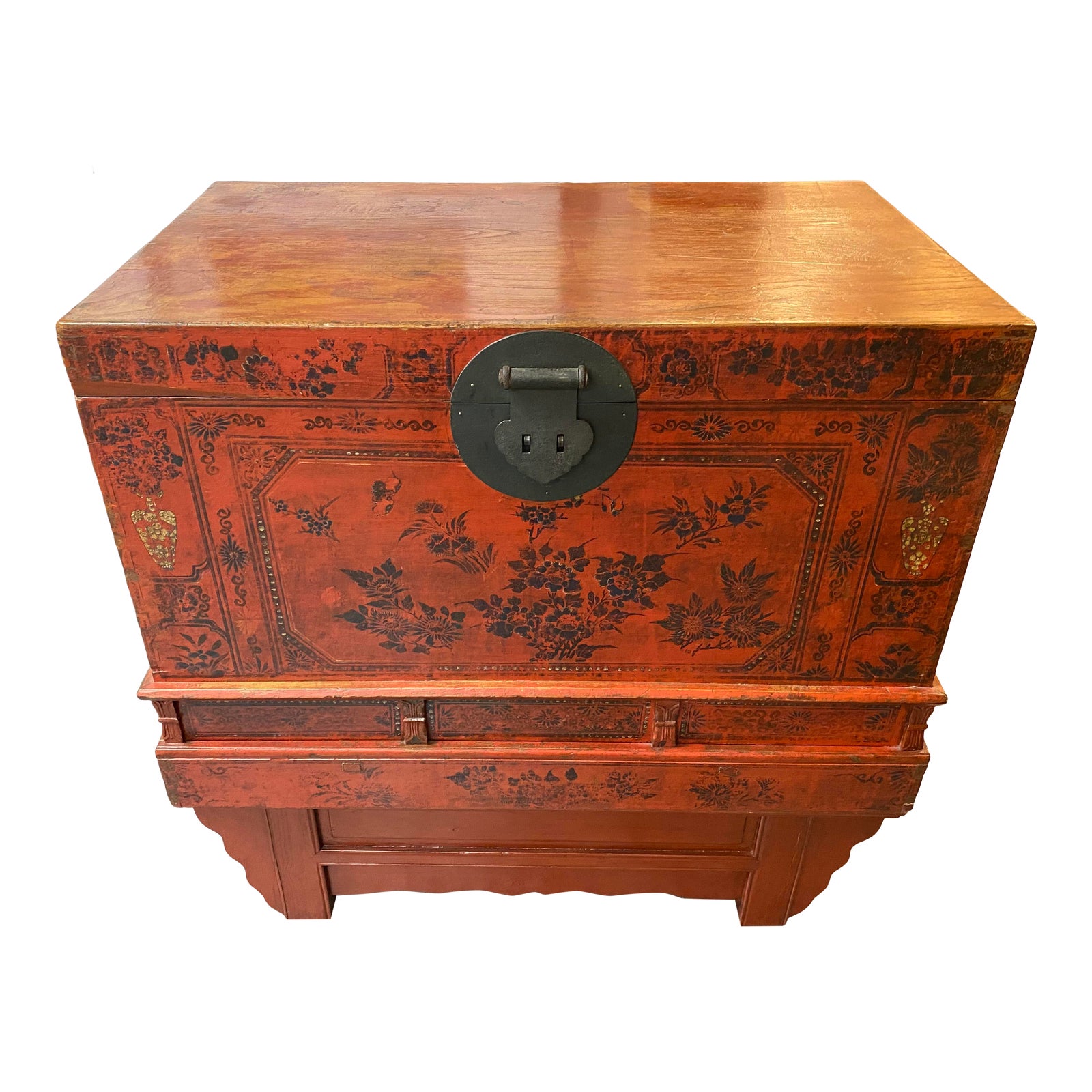 Design Plus Gallery presents an Early 20th Century Red Tansu Chest + Stand. Intricately carved elm is painted red with black botanical motifs. Handles adorn the sides with latch on front in brass. Pin is missing and there is visible wear due to age.