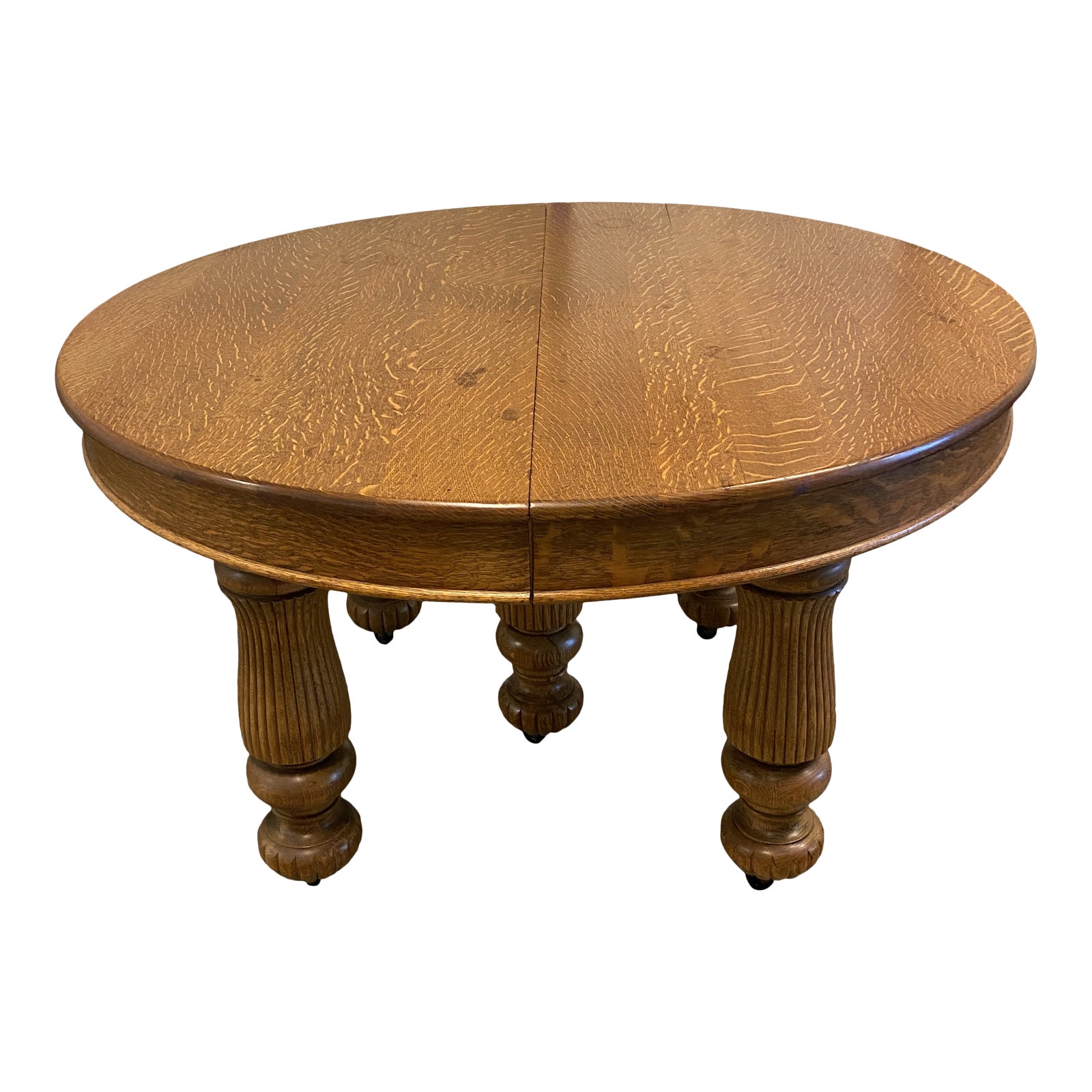 Design Plus Gallery presents a Round Early 20th Century Extension Table. Crafted from solid oak woods. Consist of four 11.5 inches extensions. Five carved pedestals with metal casters for easy mobility. Natural wear and aging.