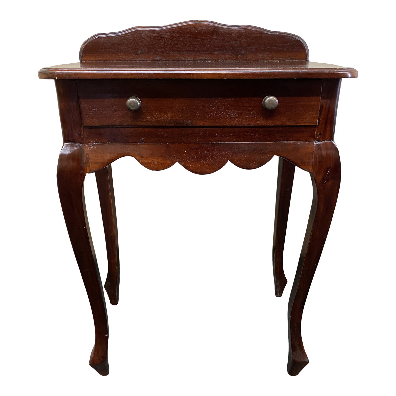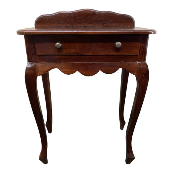 Design Plus Gallery presents a Early 20th-Century Toulouse Console. Solid wood joinery is crafted together without metal hardware. The only metal is in the oiled brass pulls. Legs are cabriole styled which continues into an elegant apron underneath the drawer. Back crest emulates the soft lines. Can be used as a nightstand, side table or entry space for keys. Visible wear due to age.