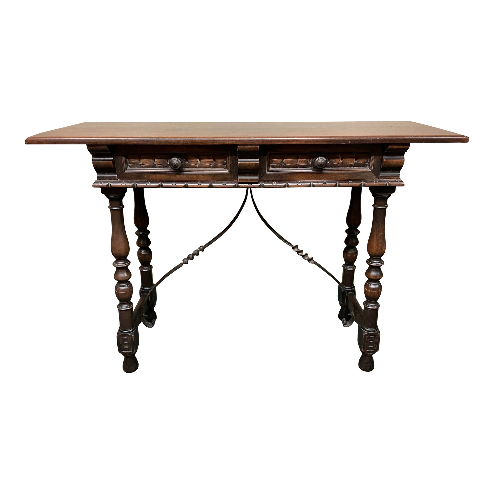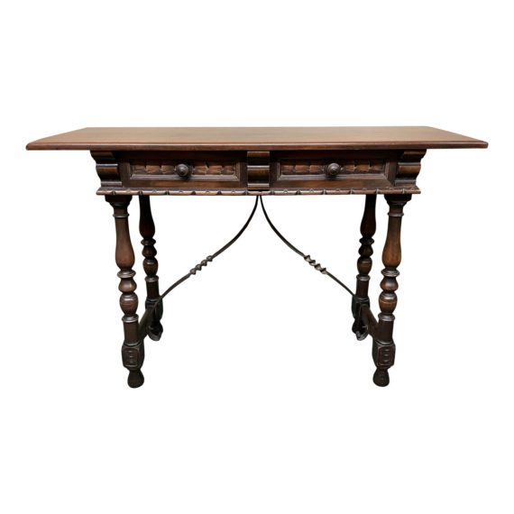 Design Plus Gallery presents a Vintage Console. A small table, it is large on details and style. Beautiful carvings and bronze pulls decorate the shallow single drawer and the elegant legs are turned tip to toe. The brace is a band of iron twisted. Broad surface keeps the piece functional in hall, behind sofa or as a television stand.