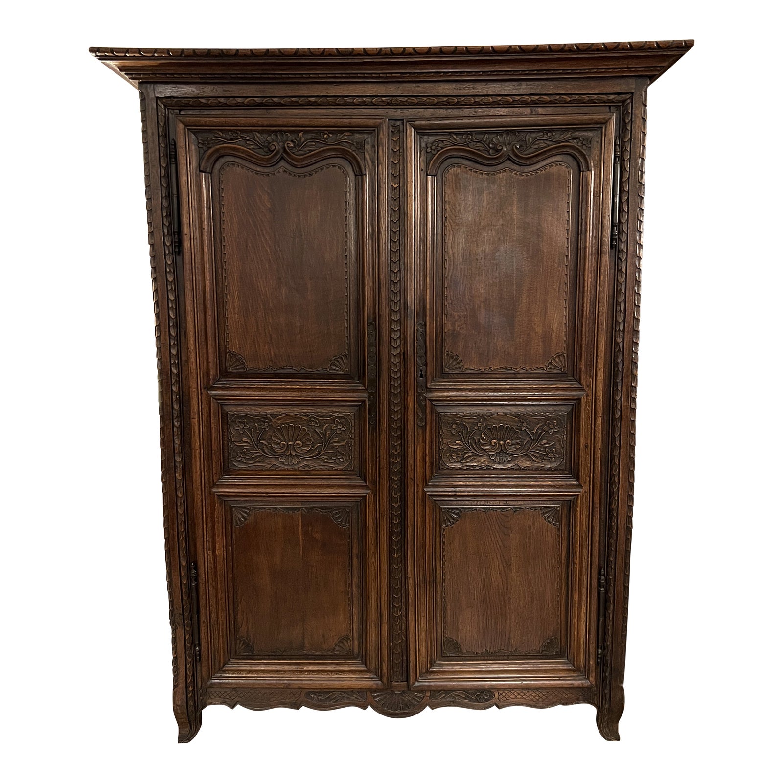 Design Plus Gallery presents an Antique Two Door Wood Carved Cabinet. Features include four drawers with wood dividers, two narrow and one wide shelf, and an open back section near which an inside light is attached. The armoire doors feature hand carved botanical accents near the top. Additional botanical accents outline the doors. This piece was modified with new built ins + visible cutout on backing. Visible and minor wear from use; armoire is in good condition.