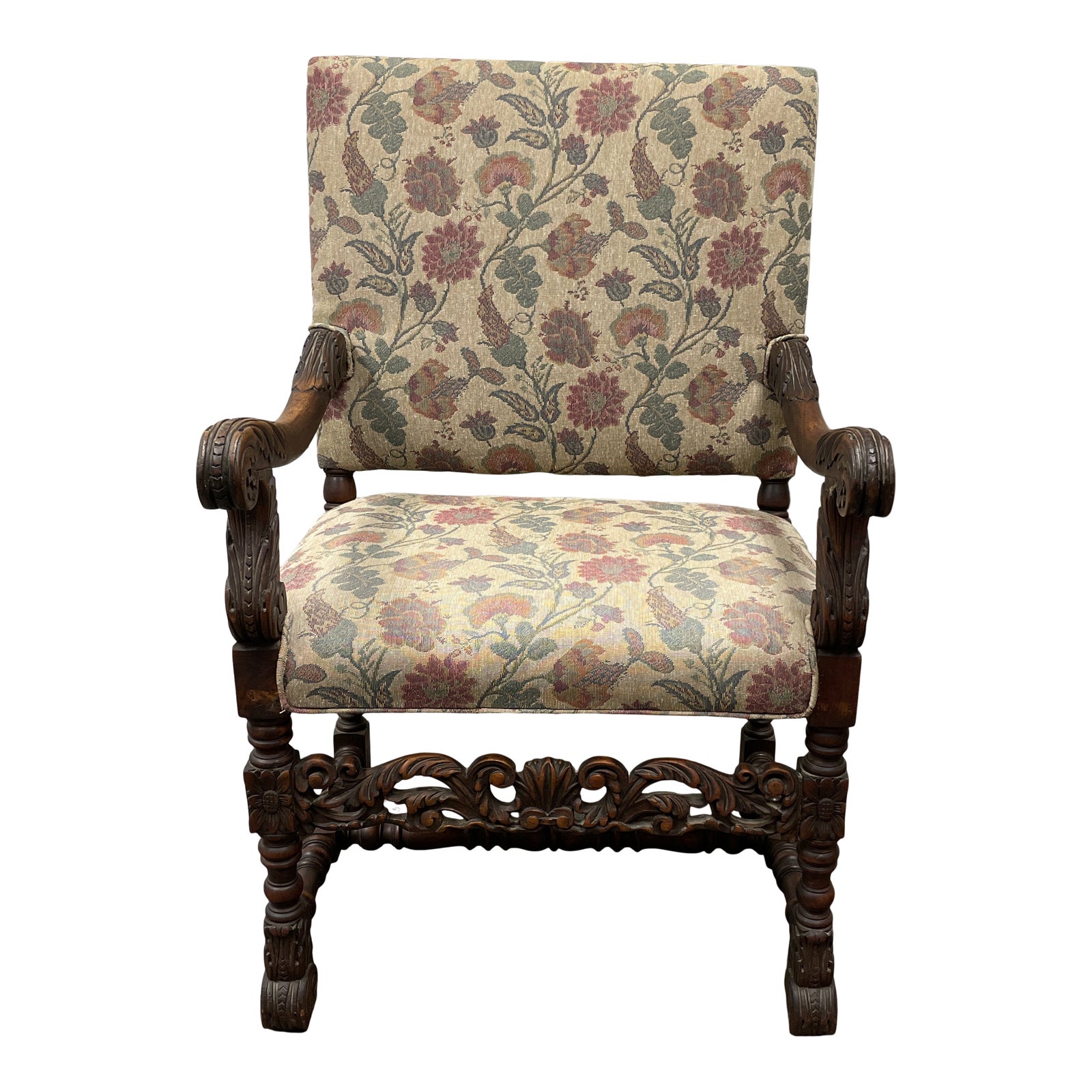 Design Plus Gallery presents a Early 20th Century Upholstered Wood Frame Floral Arm Chair. Wood frame has intricate carvings within the trestle base and empire inspired arms. Seat and back wear later reupholstered in a polyester floral fabric. Visible wear through out, good condition.