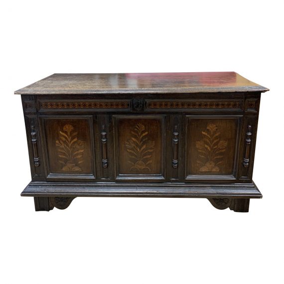 Design Plus Gallery presents a Early-20th Century Wood European + Inlaid Designs Storage Chest. Rich Mahogany stain is applied in varying degrees to bring out the beauty of wood and hand inlay application. Botanical motifs are applied in the three panels in addition to the diamond pattern which surrounds the top. Molding adds to the stately + rustic presence. Visible wear on chest and especially on top (pictured) give the piece an added sense of history. Original key is missing from the unit and the Top lifts to reveal open storage. Small compartment located on upper left part of chest with flip up top.