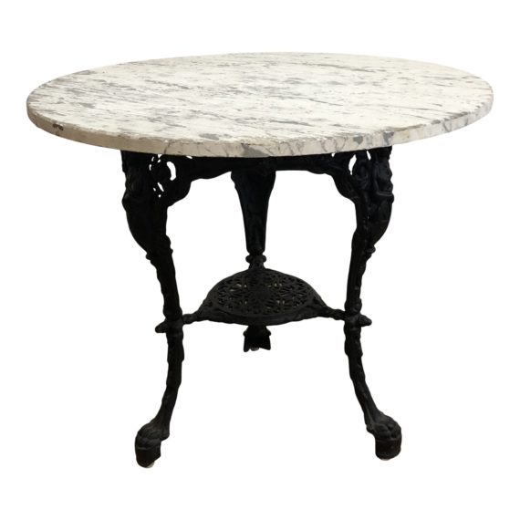 Design Plus Gallery presents a Early 20th Century Wrought Iron Bistro Table. Small diameter would also suit an entry way beautifully or as a tall end table in an living room. Maison Jensen influences hoof feet curved into a decorative trestle. Apron is adorned with figures in a Art Nouveau fashion with botanical motifs swirling about. Stone top shows wear and sits on the frame without hardware. Good condition.