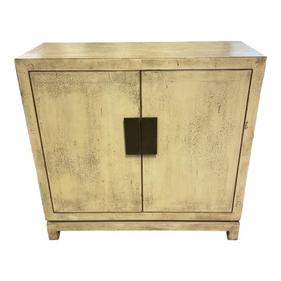 Design Plus Gallery presents a Custom Cream Elm Slatted Media Cabinet. Cream paint is distressed on the elm frame with footed base. Antiqued finish combined with the oiled brass hardware gives the look and patina of an antique Chinese armoire in a smaller more convenient scale. Back is completely slatted for easy electrical access. Minor wear through out, unit is in good condition. Purchased in Singapore.