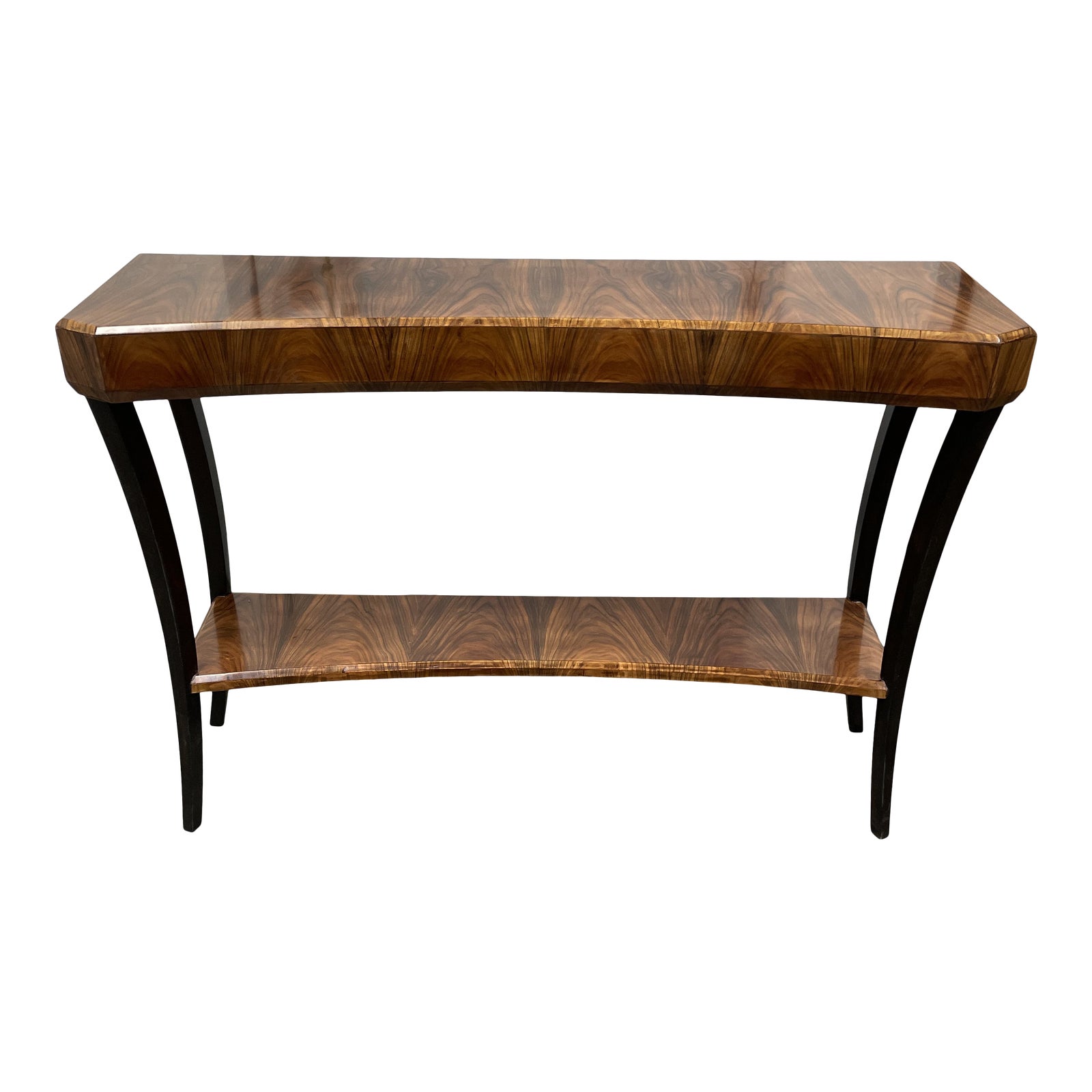 Design Plus Gallery presents a Custom Design Deco Style Rosewood Console. High saber legs contrast in a black satin finish with an inverted double arch on the lower shelf and the top with rosewood veneers. Custom made in USA. Minor wear on surfaces. Top has a thick perimeter with an elegant bevelled edge and curved apron. Narrow and high proportions are ideal for tight spaces and give ample opportunity for accessorizing and layering.