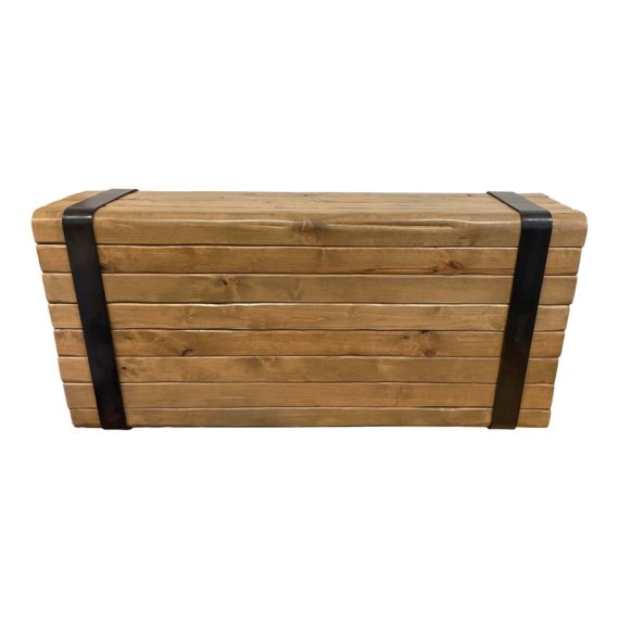 Design Plus Gallery presents a Custom Design Console / Coffee Table. A unique versatile design that is suitable as a Console or Coffee Table. A bundle of stacked woods with an iron metal wrapping. The middle and backing is hollow, not visible from the front. This is a very solid and heavy item. Made in USA.