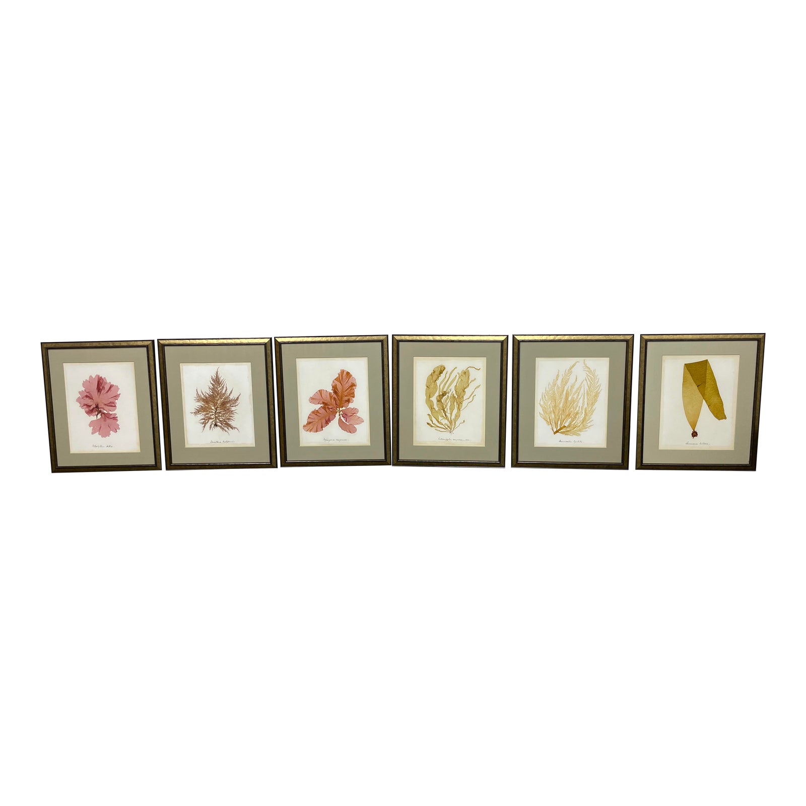 Design Plus Gallery presents a Set of Six Custom Framed Botanical Prints. Beautifully framed in a bronze frame with a silk sea foam green matte. Compositions show the beauty of natural forms flattened against a high contrast ivory background. Each study is labelled bellow in script. Minor wear on surfaces, set is in good condition.