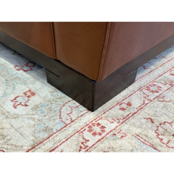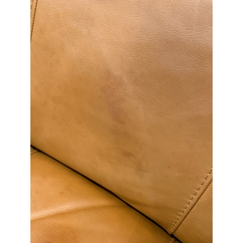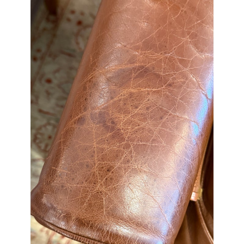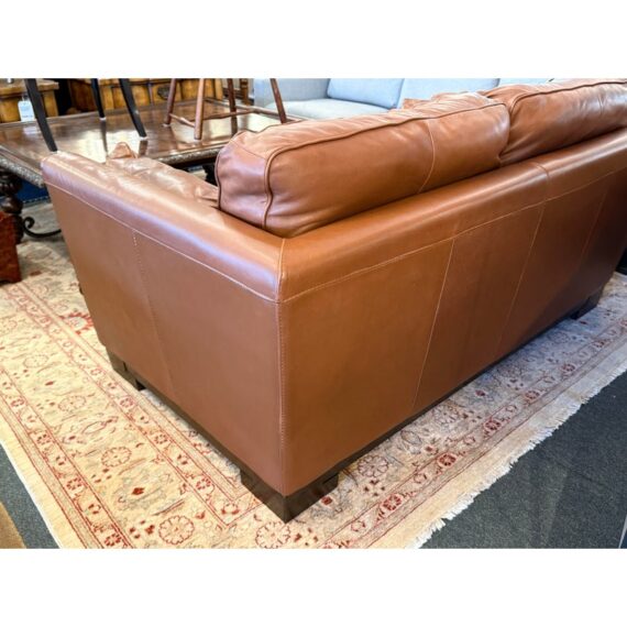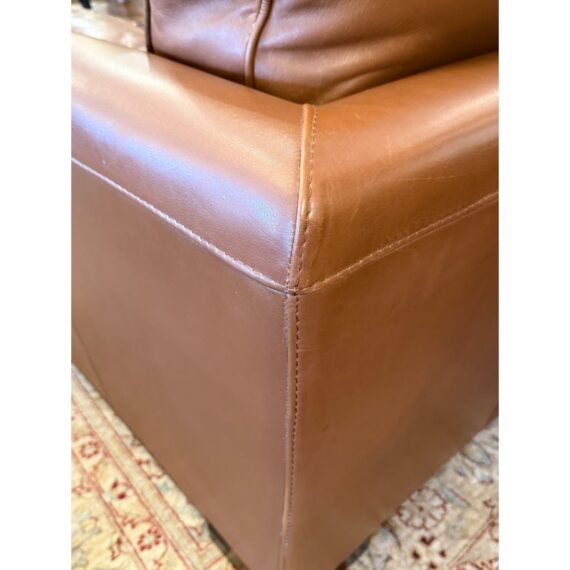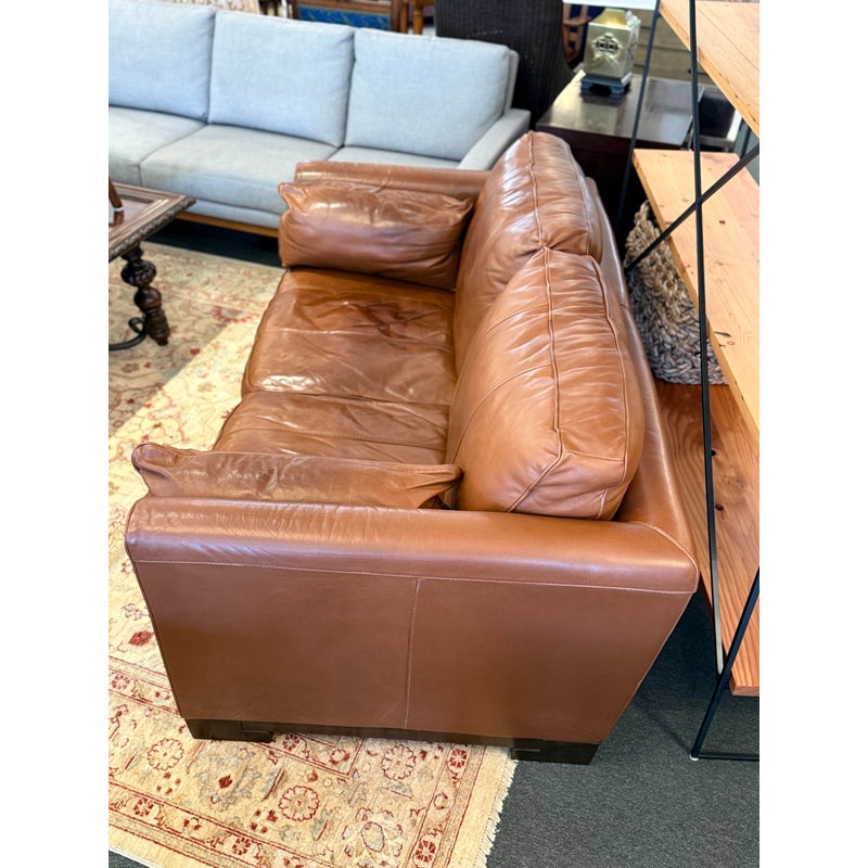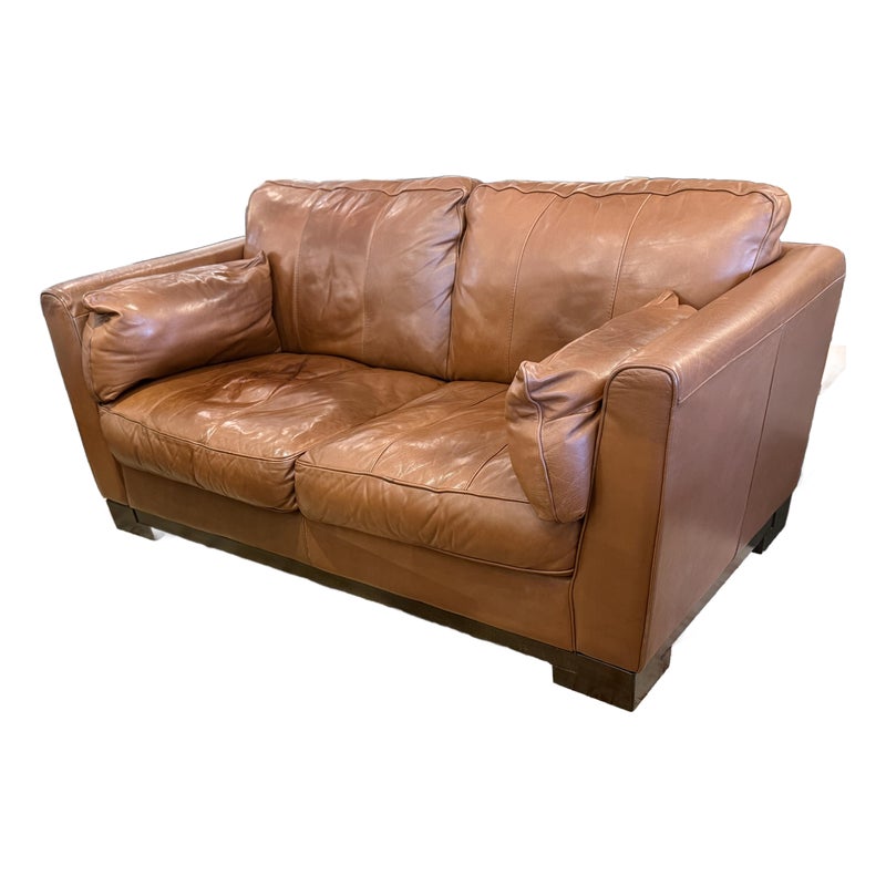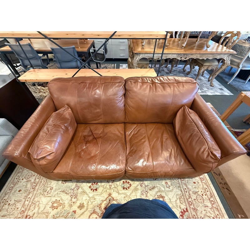 Design Plus Gallery presents an Italian Leather Sofa. This comfortable sofa has a lot going for it, even with the years it has under its belt. The leather has held up remarkably and is of fine Italian quality. Expertly wrapped with thick plush cushions + contemporary style means that this has a whole new life ahead of it. The sofa offers two bench cushions, two loose back cushions and two side lumbar pillows. Overall there is general wear to the leather + an opening on the back side of a cushion but is still in good condition.