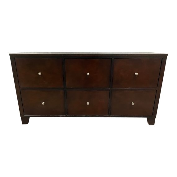Design Plus Gallery presents a Contemporary Espresso Stained Six Drawer Dresser. Dovetail joinery makes all of the drawers which are equal size. expansive surface space gives a convenient spot to get ready for the day or display decorative objects. A contrasting brushed steel hardware pull contrasts the dark espresso wood tone on each drawer. Visible wear through out. Good condition.
