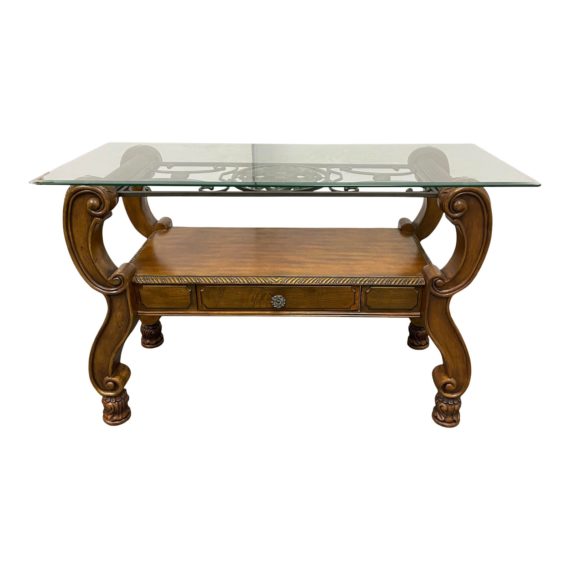 Design Plus Gallery presents a Traditional Wood Base + Glass Top Console Table. Ornate woodwork with old world inspired wrought iron makes for an open and airy statement. Glass top is ready to accessorize and layer with the shelf bellow. A drawer sits within the shelf for storing smaller items. Minor wear through out, console is in good condition.